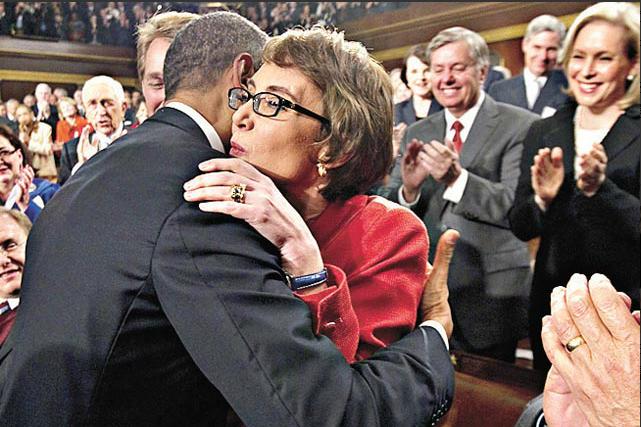 4 m# J& C; W/ t( Z0 o去年遭槍擊、剛宣佈辭職的女眾議員吉福茲,現身國會議事堂,與奧巴馬擁抱,以示支持。