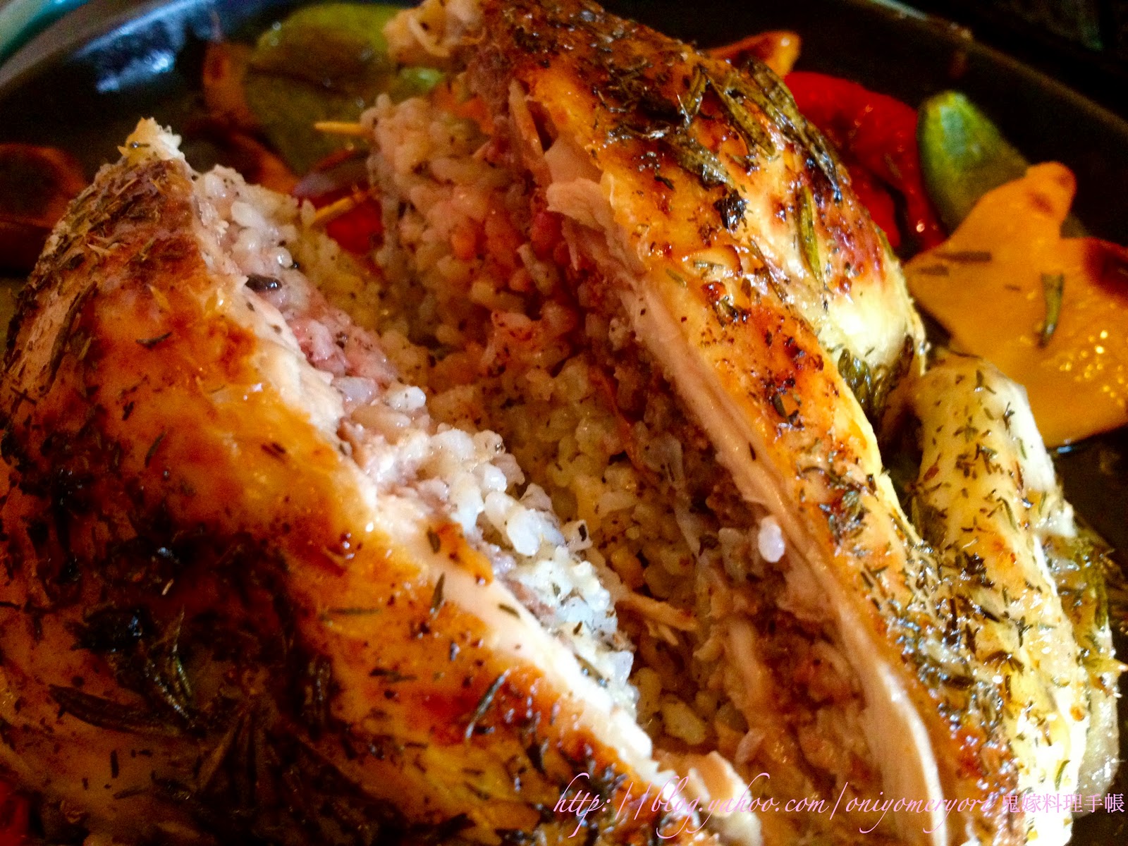 很豪的名字呀! 不過慳家的我不會真的買黑松露啦! 用幾十元的黑松露醬已經很有風味了。其實跟一般的焗雞分別不大,只是撈飯再釀飯,很簡單,以前試過用野米來釀,野米又要蒸又要煮,很麻煩,用白飯超方便。用大雞也可以,只須增加調味份量,這個是午餐來的,相公非常失望,我以為他覺得不好吃,原來他覺得太可惜,說應該做晚餐,那可以配紅酒來吃,那唯有再焗好了。繼續用新玩具LC 31cm grill pan 當焗盤來焗。$ a* Q! t: V% C. g