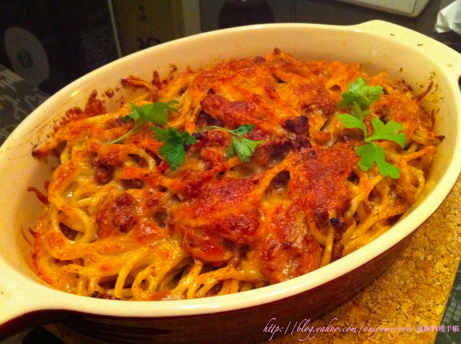 3) 加入意粉拌勻肉醬,煮約2分鐘,熄火,肉醬意粉轉到焗盤& ^: m* B. X/ }2 v, w$ W3 c