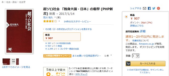 先週末というか年度末に在庫有りだった拙著「超ソロ社会」が急速に売れ、在庫なしになりました。それどころか入荷1~2か月待ちになっています。PHPさん、年度末棚卸作業お済みになりましたら補充の方よろしくお願いします! せっかくお買い求めいただこうとされた方、申し訳ございません@PHP_Businesstvb now,tvbnow,bttvb3 M. i2 e" Y* E$ q! ?6 f2 R