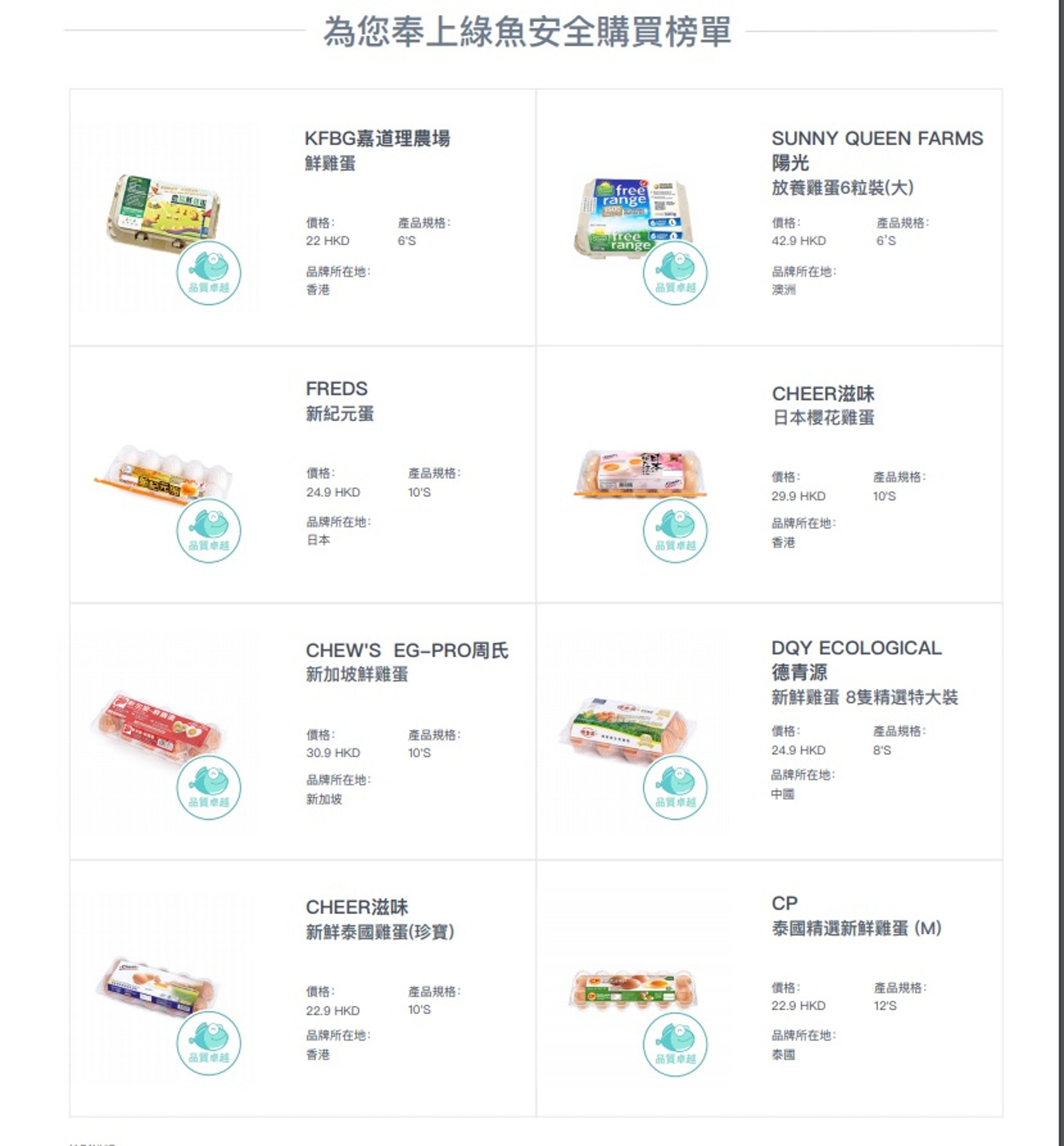 團隊提供了其中8款被評為可安全食用的雞蛋,當中包括常被搶購的「KFBG嘉道理農場鮮雞蛋」、產自澳洲的「陽光牌放養雞蛋6粒裝(大)」及產自內地的「德青源新鮮雞蛋8隻特大裝」等。