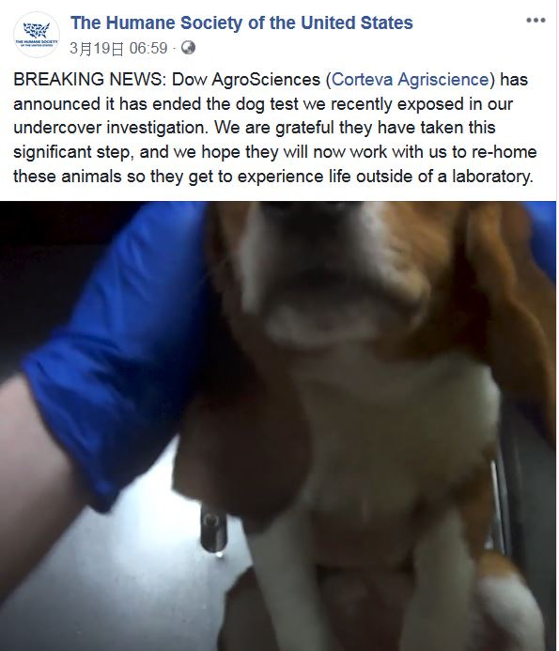 在眾多壓力下,農化公司最終「跪低」,宣布停止用狗狗做實驗。(fb:HSUS)