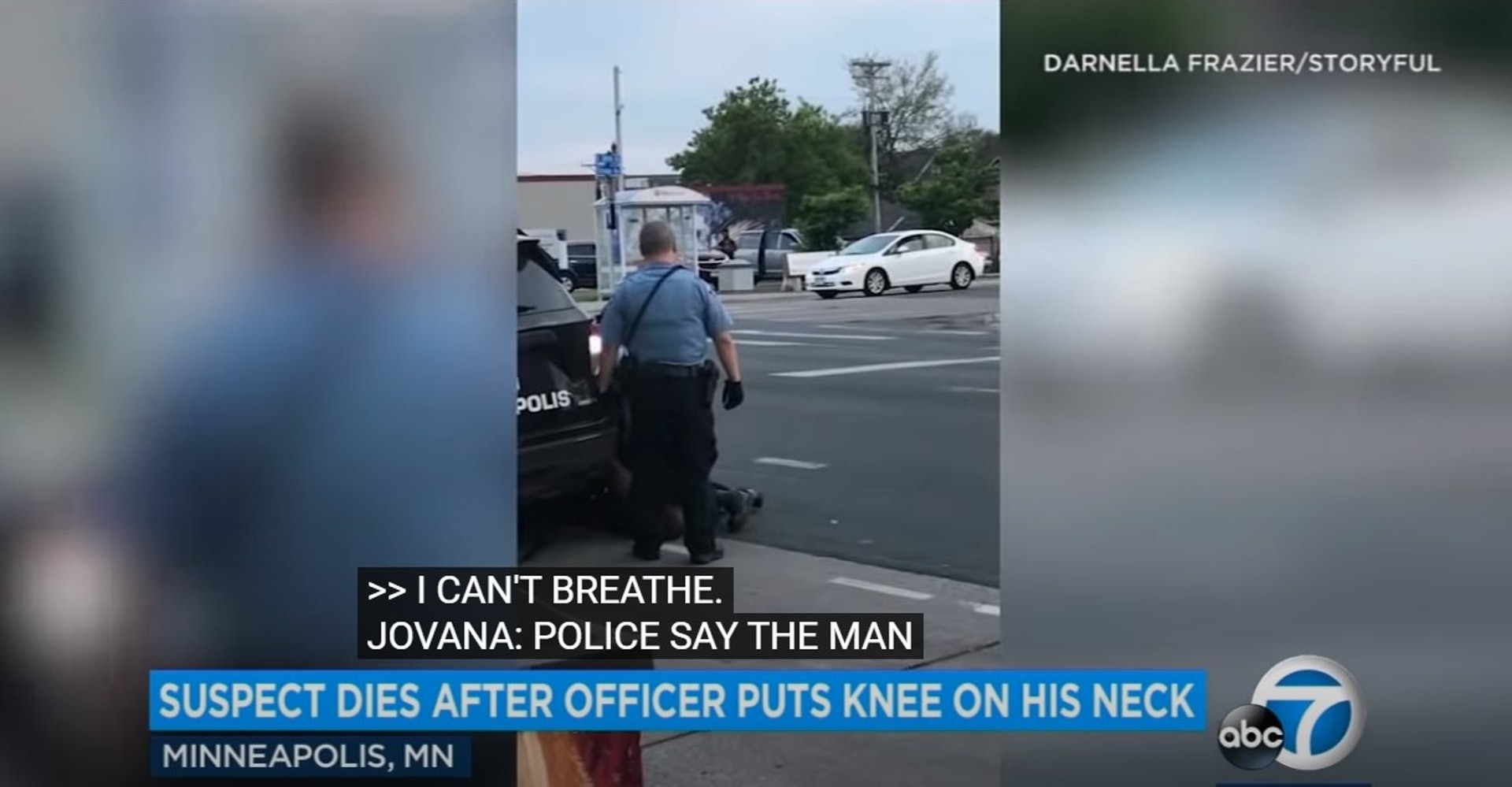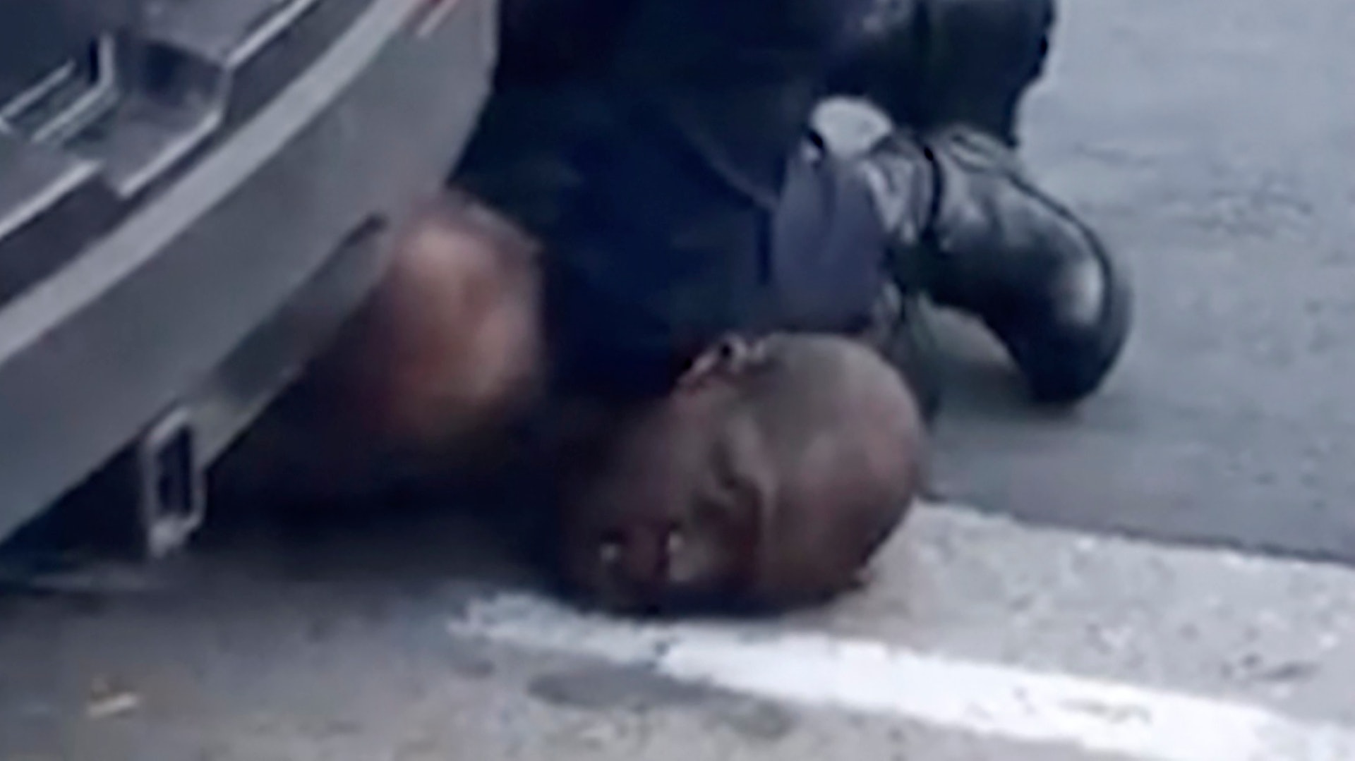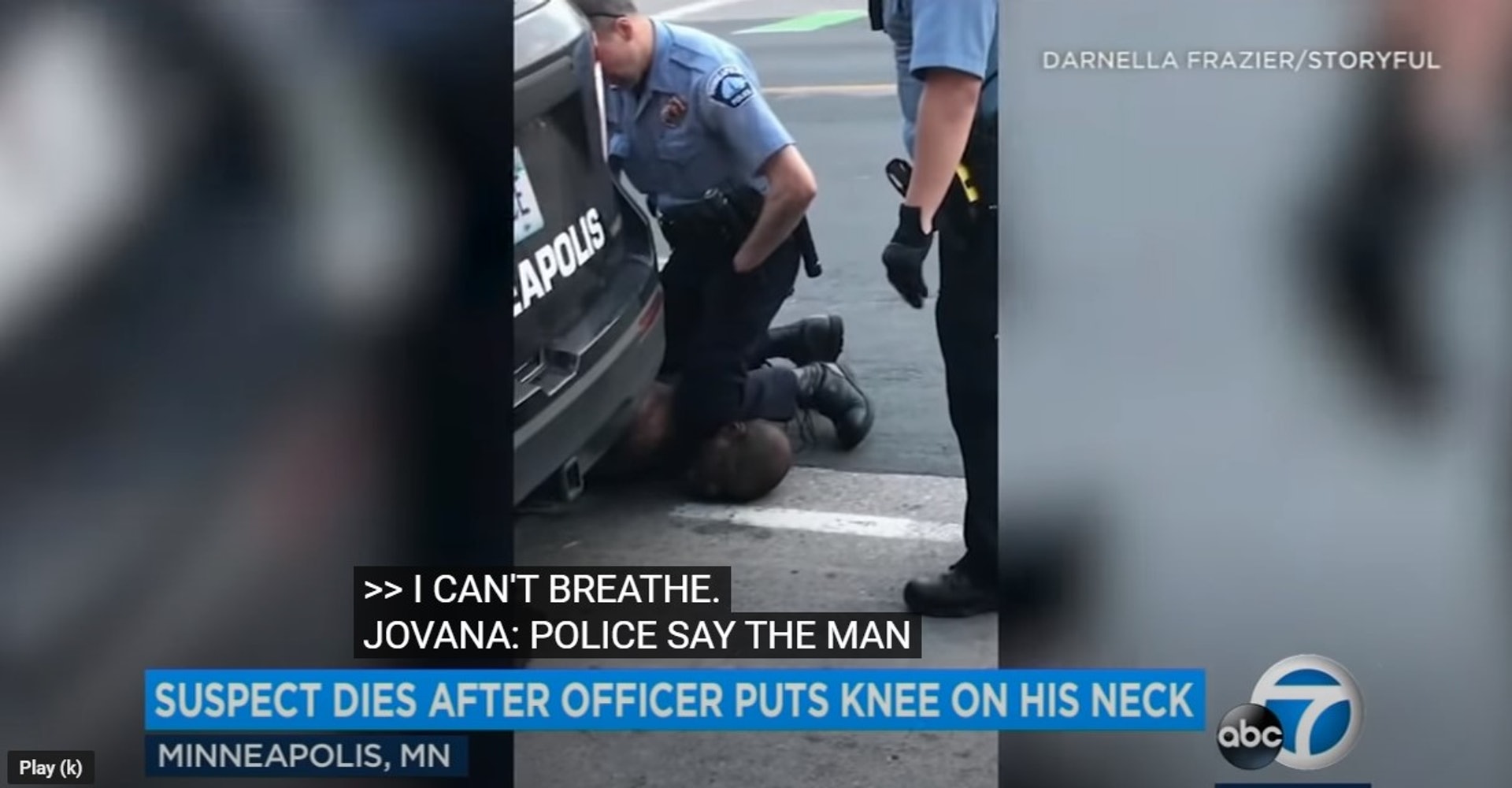 圖為途人在5月25日拍下美國非裔男子喬治・佛洛伊德被警員以膝蓋壓在地上的情形。即使後來他已動彈不得,警員亦不放鬆。(美國廣播公司新聞影片截圖)