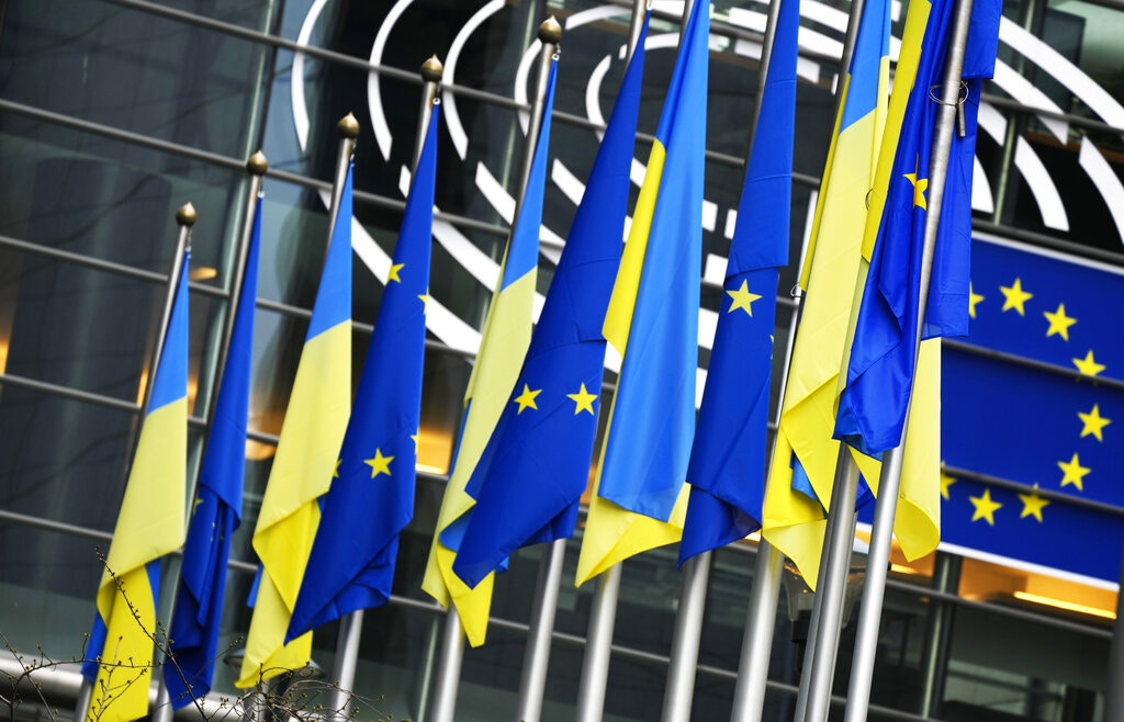 - p: Y- p/ X3 P4 _; _/ ? H! J公仔箱論壇烏克蘭局勢:2022年3月1日,位於比利時布魯塞爾的歐洲議會舉行的烏克蘭問題特別全體會議之前,烏克蘭和歐盟的旗幟懸掛在大樓外部。3月1日歐洲議會發聲明稱,已通過一項決議,呼籲歐盟機構「努力授予」烏克蘭歐盟候選國地位。(AP)8 ]3 n4 v1 K7 ~# ?$ f; r
