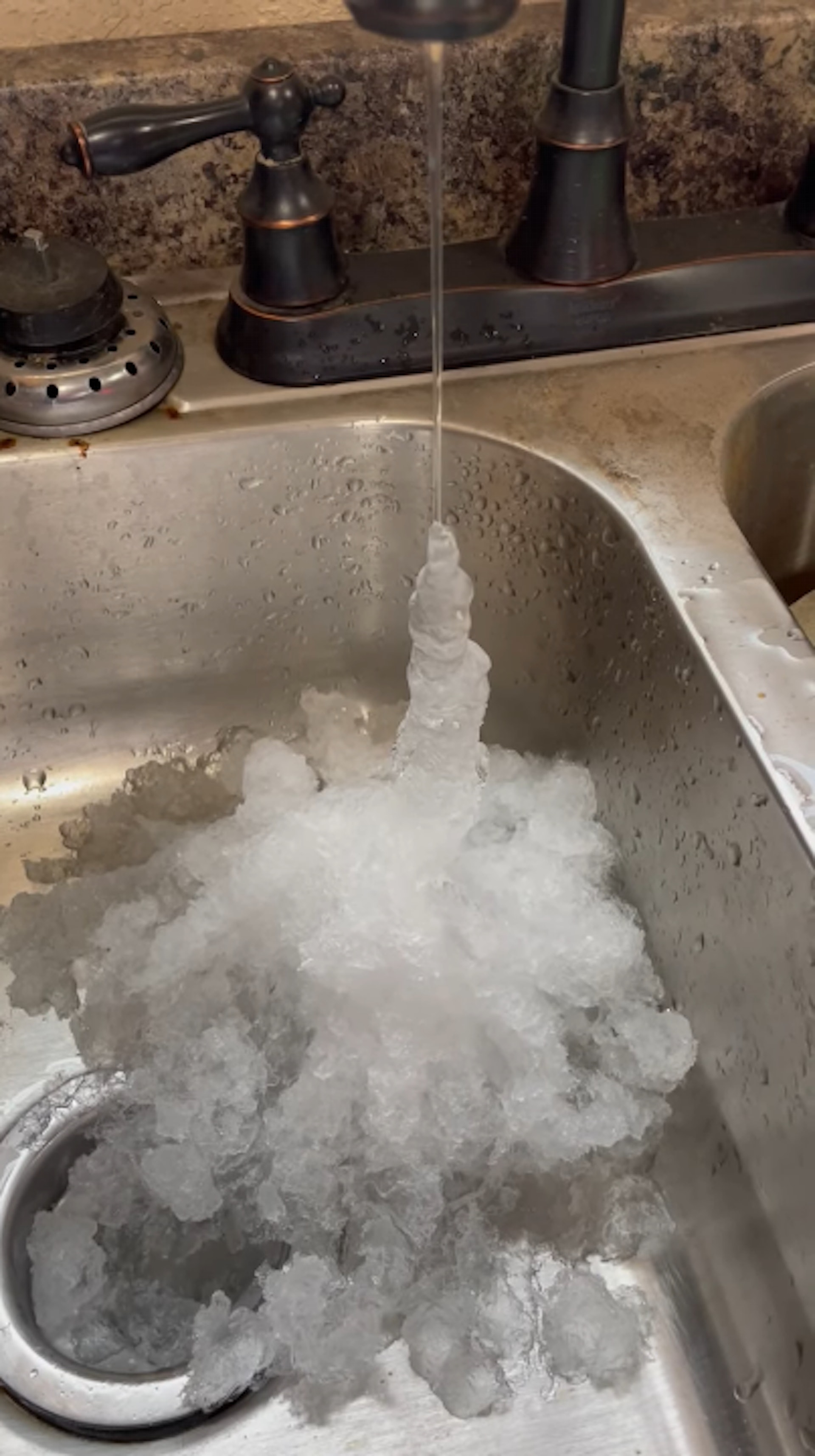 $ T6 v8 n; c/ |5 a, E! X# r% _美國最冷聖誕節:在俄克拉何馬州麥卡萊斯特(McAlester),一名女子拍下她在家裏打開水龍頭的畫面,只見自來水流出後,很快就變成冰,結成冰柱(影片截圖)