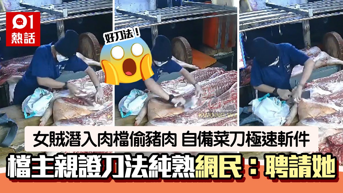 以小偷來說她的刀法非常熟練。馬來西亞檳城近日發生罕有的偷豬肉事件,1名大媽深夜潛入當地巴剎(即街市),拿菜刀切走放在肉檔內的生豬不同部位的肉,一一放入膠袋後走人,閉路電視片段在當地引起熱議。肉檔老闆至清晨回檔口準備時,眼利發現豬隻少了些肉,翻查閉路電視揭發事件,不禁指該豬肉女賊有「純熟刀工」,但他因為怕麻煩而沒有報案。網友一看認為女賊是「同行」,又笑言她可能想把偷來的豬肉煮肉骨茶吃。