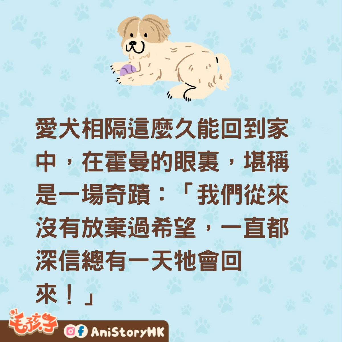 愛犬相隔這麼久能回到家中,在霍曼的眼裏,堪稱是一場奇蹟:「我們從來沒有放棄過希望,一直都深信總有一天牠會回來!」