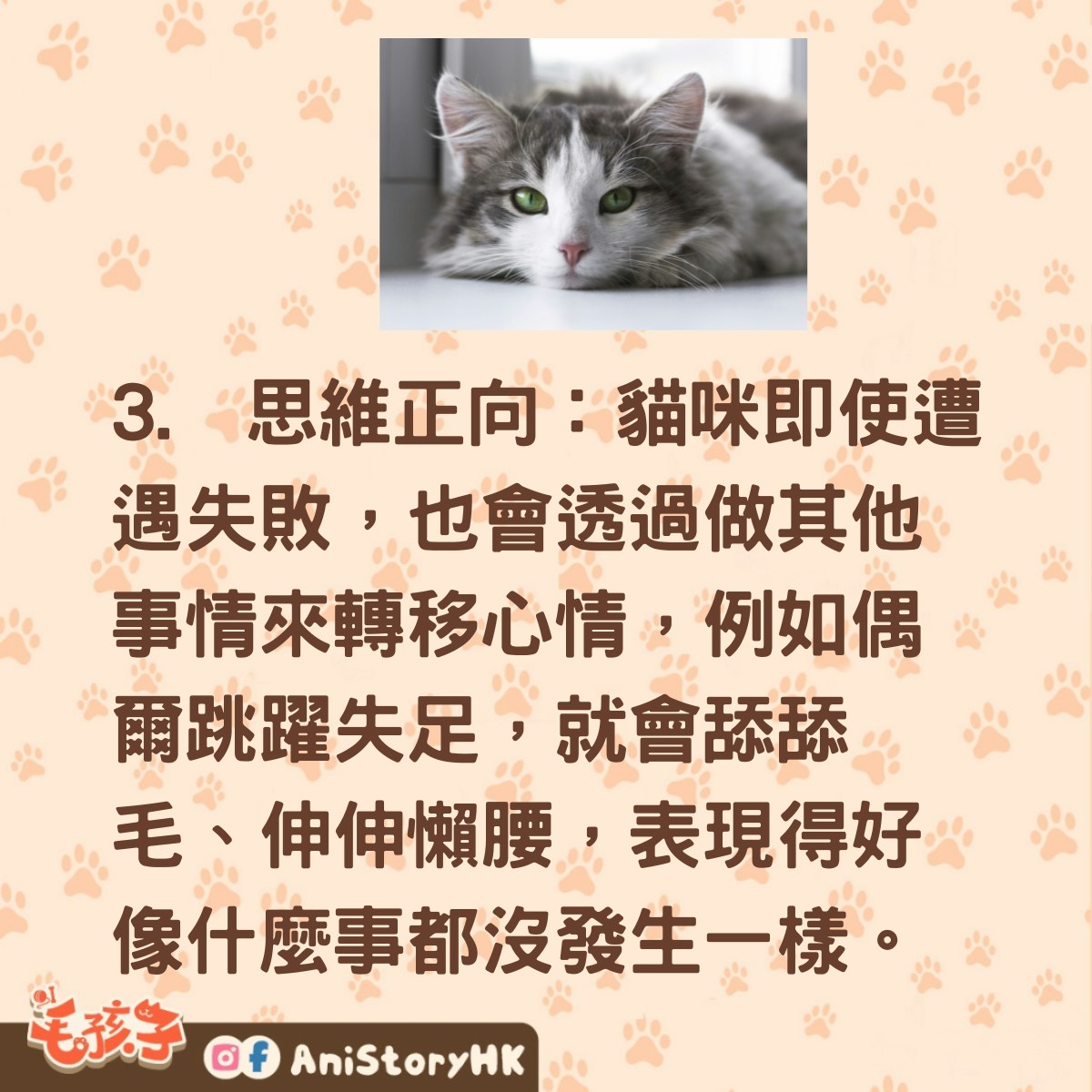 3. 思維正向:貓咪即使遭遇失敗,也會透過做其他事情來轉移心情,例如偶爾跳躍失足,就會舔舔毛、伸伸懶腰,表現得好像什麼事都沒發生一樣。
