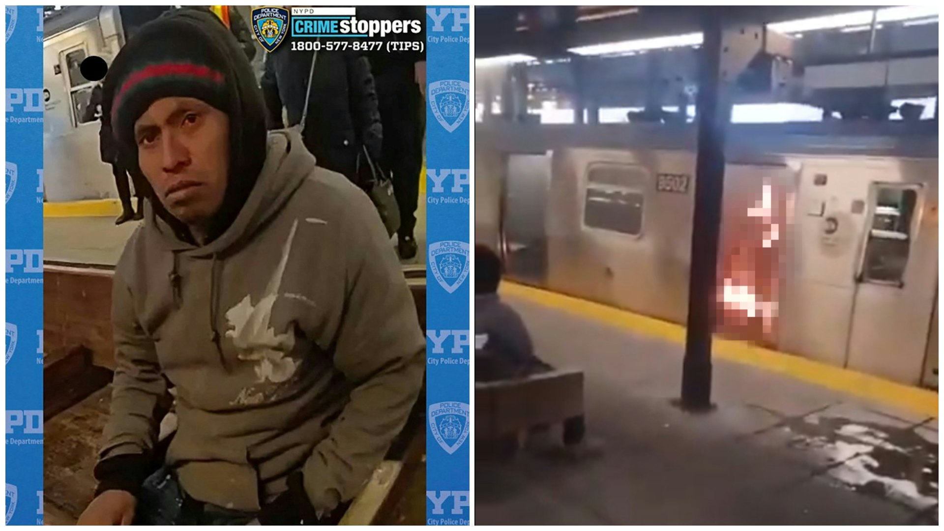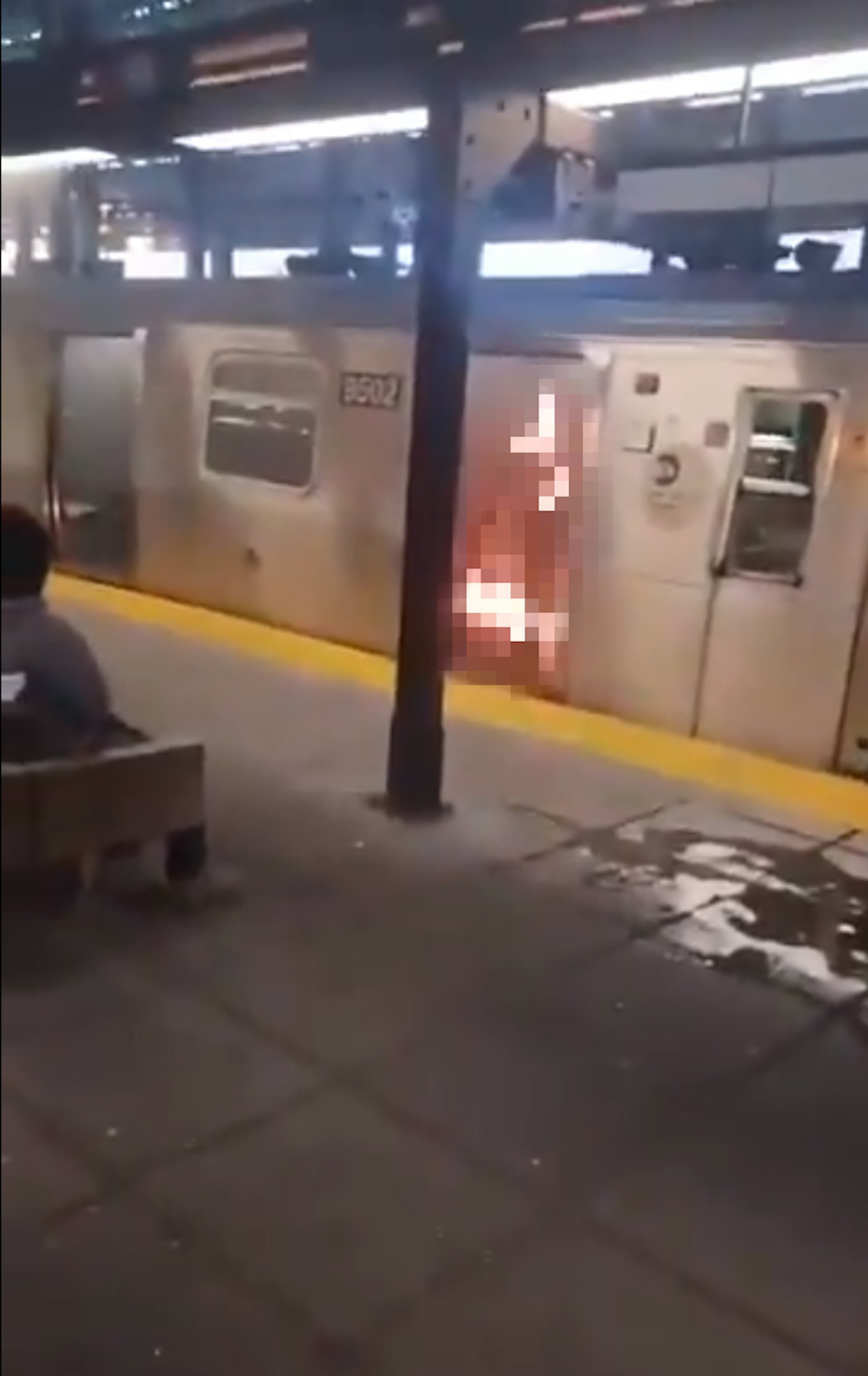 ( `* ^( c/ P, E. ?. a1 }: K9 B紐約地鐵縱火案中,閉路電視片段顯示疑犯在案發時坐在車站月台長凳上,看着車廂內的火海(影片截圖)