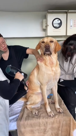 粉專臺中GoGo - 狗狗 -臺中搜救犬分享影片,只見Ring仰著頭接受吹風機暖風吹拂,銷魂的表情不用說明,一看就是對於洗澡服務非常滿意,而這並不是在寵物美容院,而是在光復災區。 社團法人寵物保母召集了許多寵物美容師、獸醫、獸醫助理、志工等,來照顧災區獲救的毛小孩,不僅如此,前去協助救災的搜救犬也被妥善照顧。
