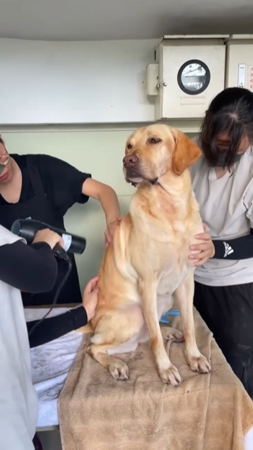 台中搜救犬Ring享受著洗澡吹毛,一隻狗狗有3位寵物美容志工服務,看牠快要睡著的表情,就知道洗香香有多舒服了!Ring參加花蓮光復鄉救災,社團法人寵物保母協會召集了志工,不僅照顧災區獲救毛孩,也幫搜救犬們洗淨一身泥濘。