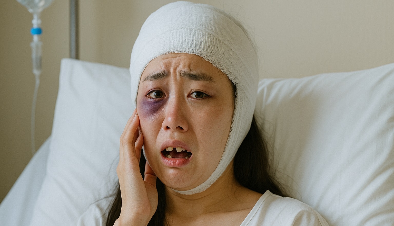 受害人頭部縫了好幾針,眼睛瘀青,肩膀受傷,牙齒更被打掉。(AI生成圖片)tvb now,tvbnow,bttvb, N0 q5 T' k( _$ Z. A
