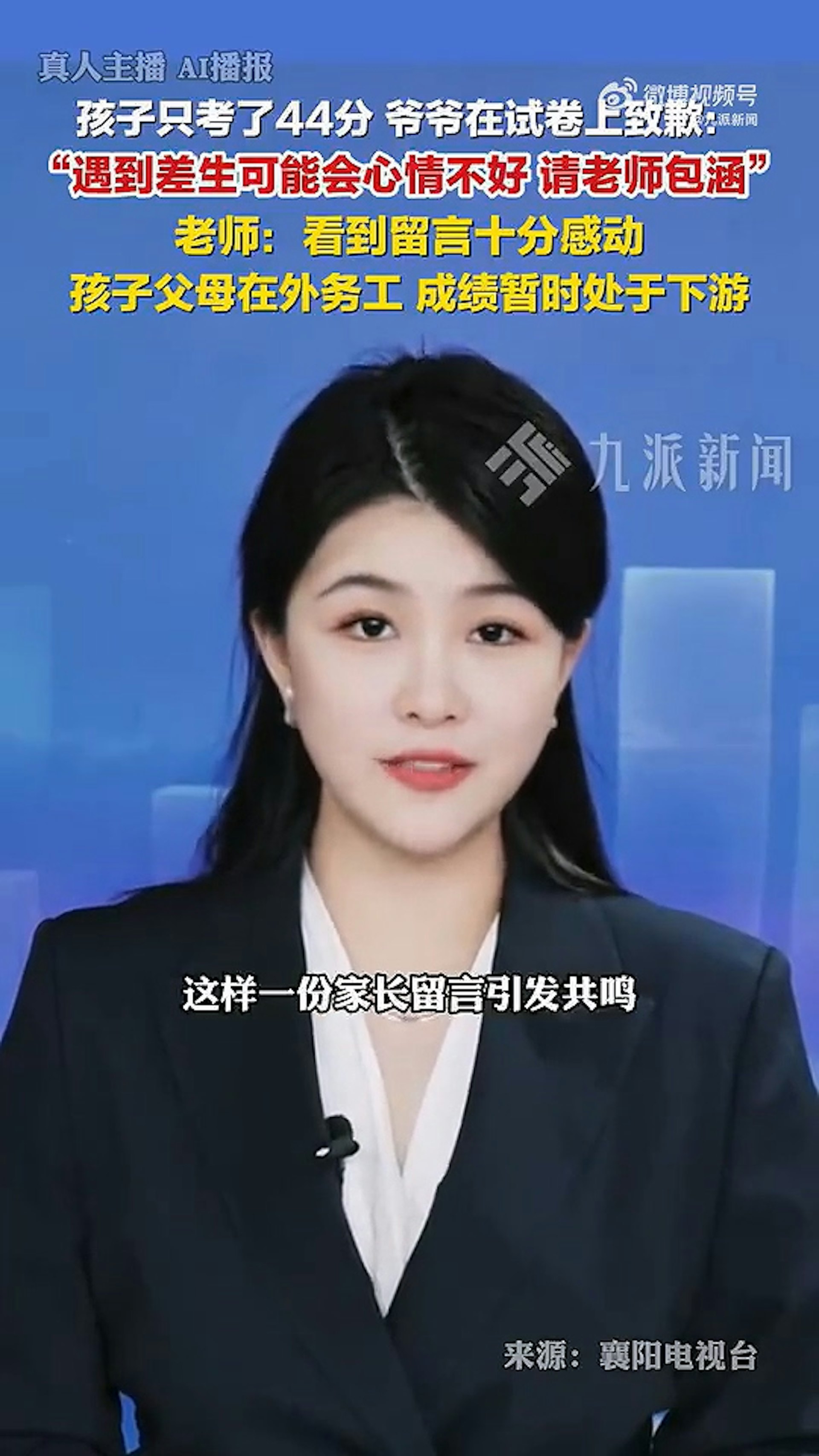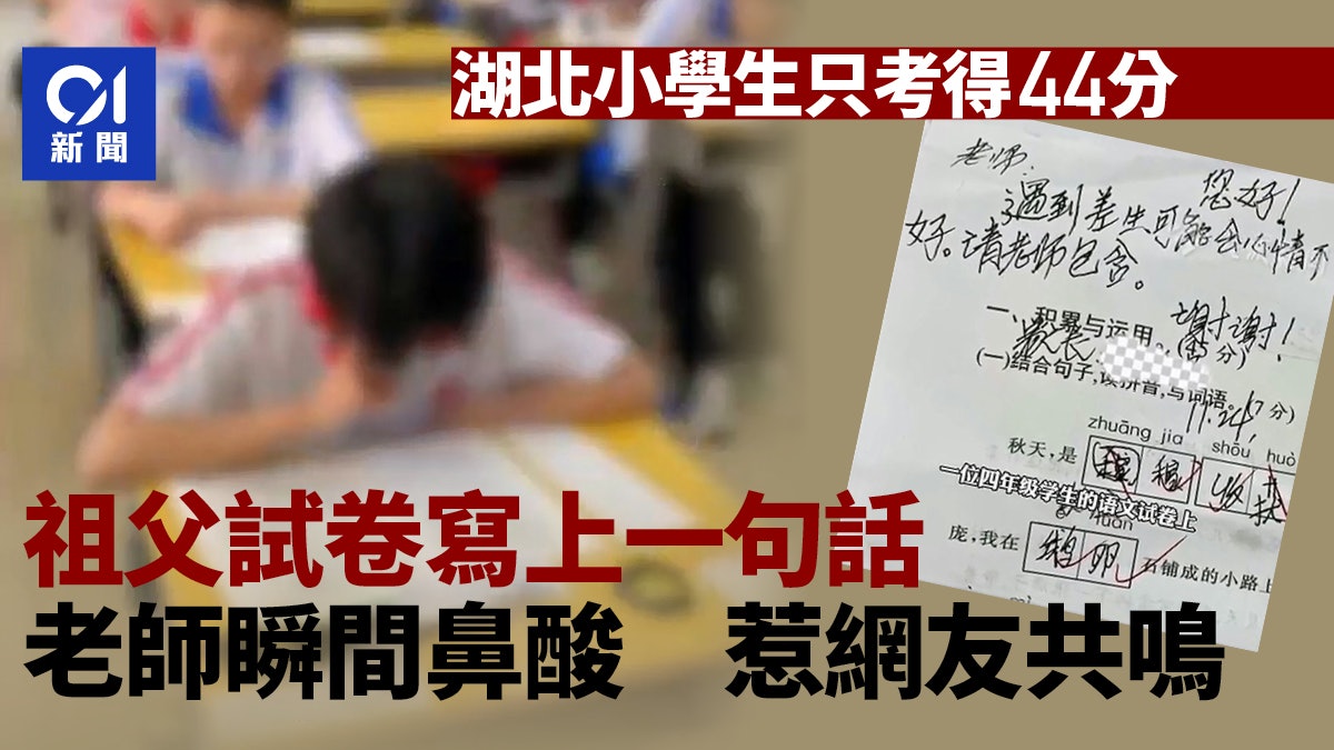 0 r1 B1 T; a6 S/ t8 U3 F d湖北宜城一名小學生考了44分,試卷上卻意外多了一句字跡質樸的留言:「遇到差生可能會心情不好,請老師包涵。」這段話出自孩子的爺爺,被老師讀到後瞬間觸動。