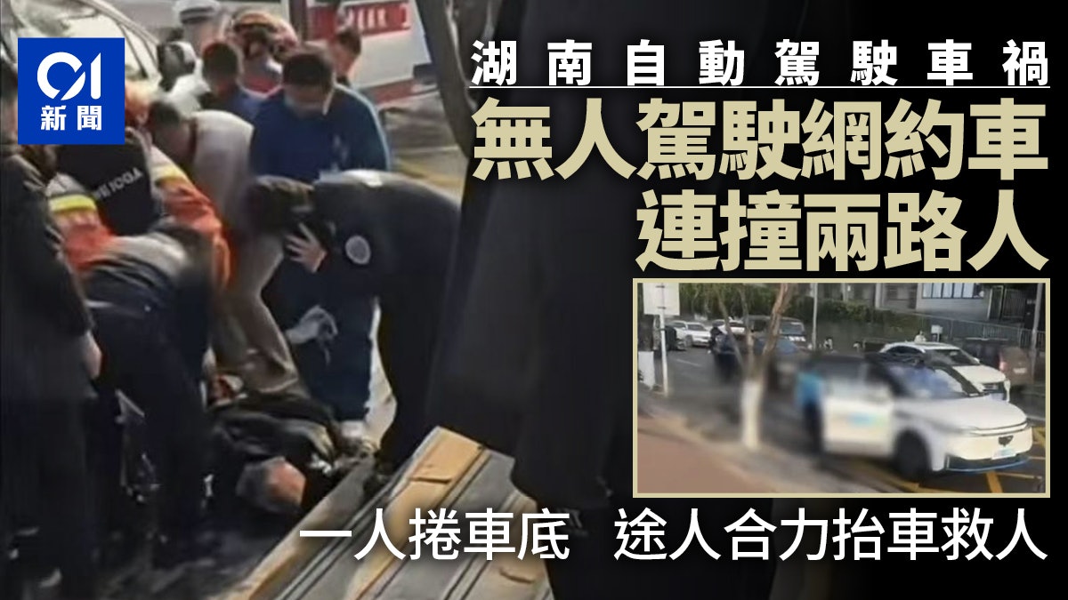 湖南株洲一輛哈囉出行的無人駕駛網約車撞傷兩名路人,周邊有熱心市民抬車救人,引發關注。(影片截圖)