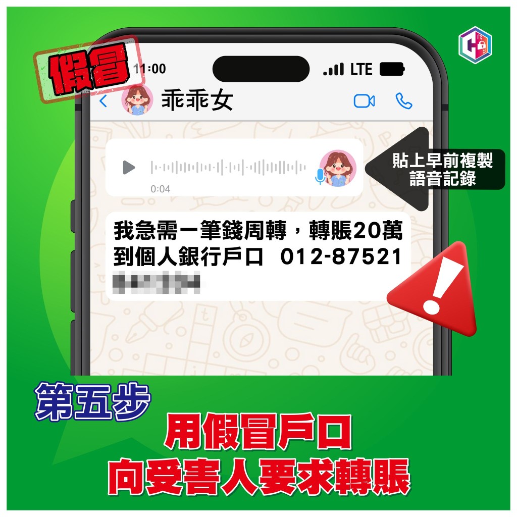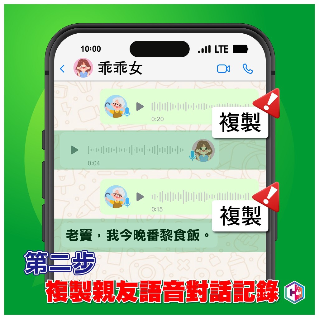 二:騙徒複製受害人女兒早前發送的語音短訊,其後刪除受害人與其女兒所有對話記錄;
