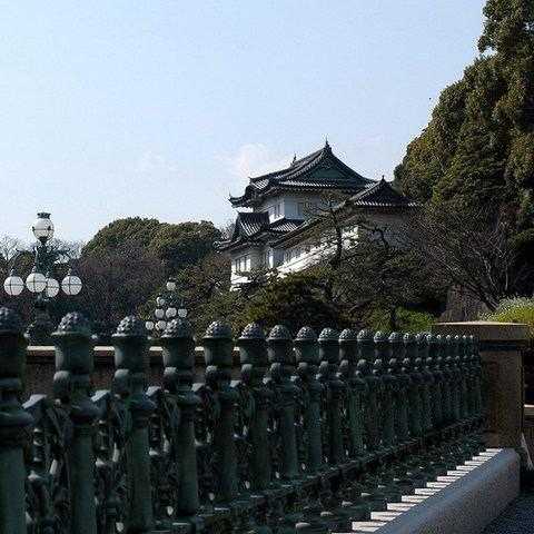 这一处占地23000平方米的日本传统建筑,它有绿色的瓦顶、白色的墙壁和茶褐色的铜柱。其中正殿是整个宫殿的中心,皇室的主要活动和外交礼仪都在正殿的“松之阁”举行,长和殿是天皇接受群众朝贺的地方,丰明殿内有大宴会场,常御殿为天皇内宫。皇宫正门前一座双孔拱式铁桥,桥身分上下两层,故名二重桥,是观赏皇居和拍照的最佳位置。此外,宫内还有花阴亭、观瀑亭、霜锦亭、茶室、皇灵殿、宝殿、神殿、旧御府图书馆等等。