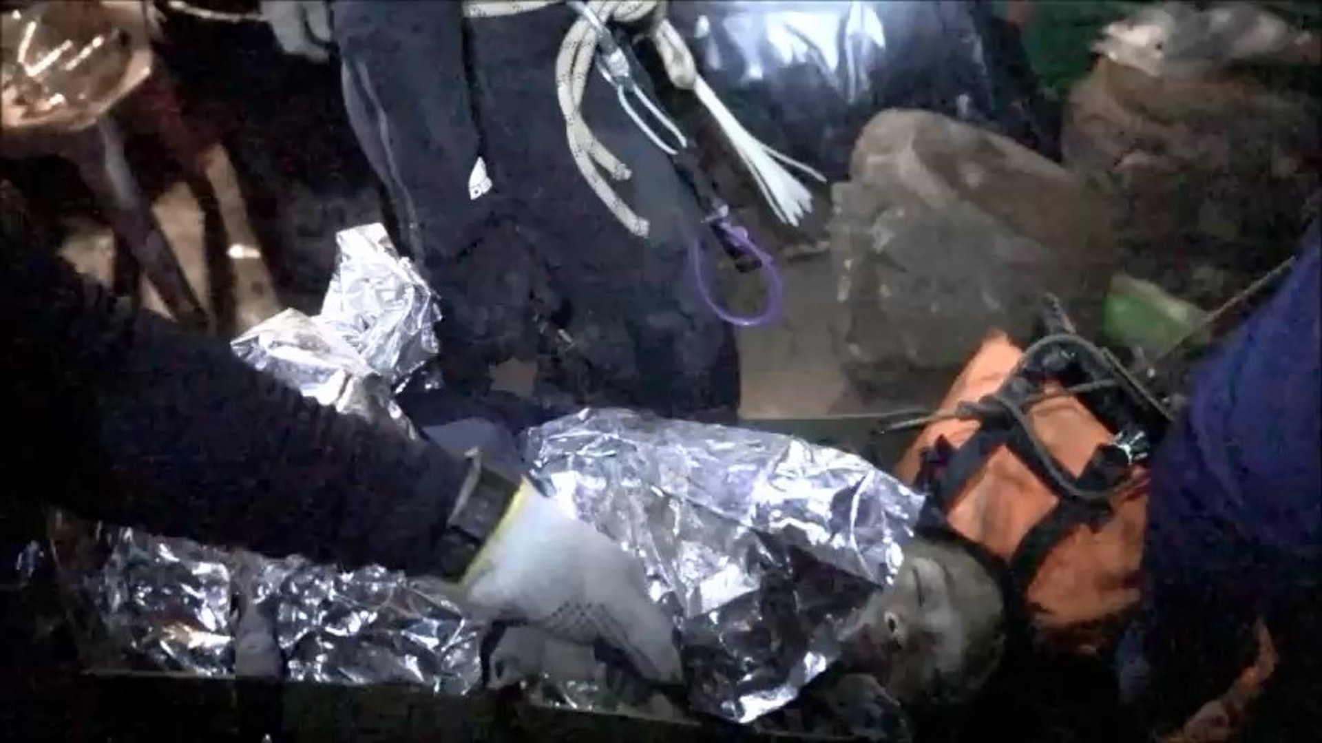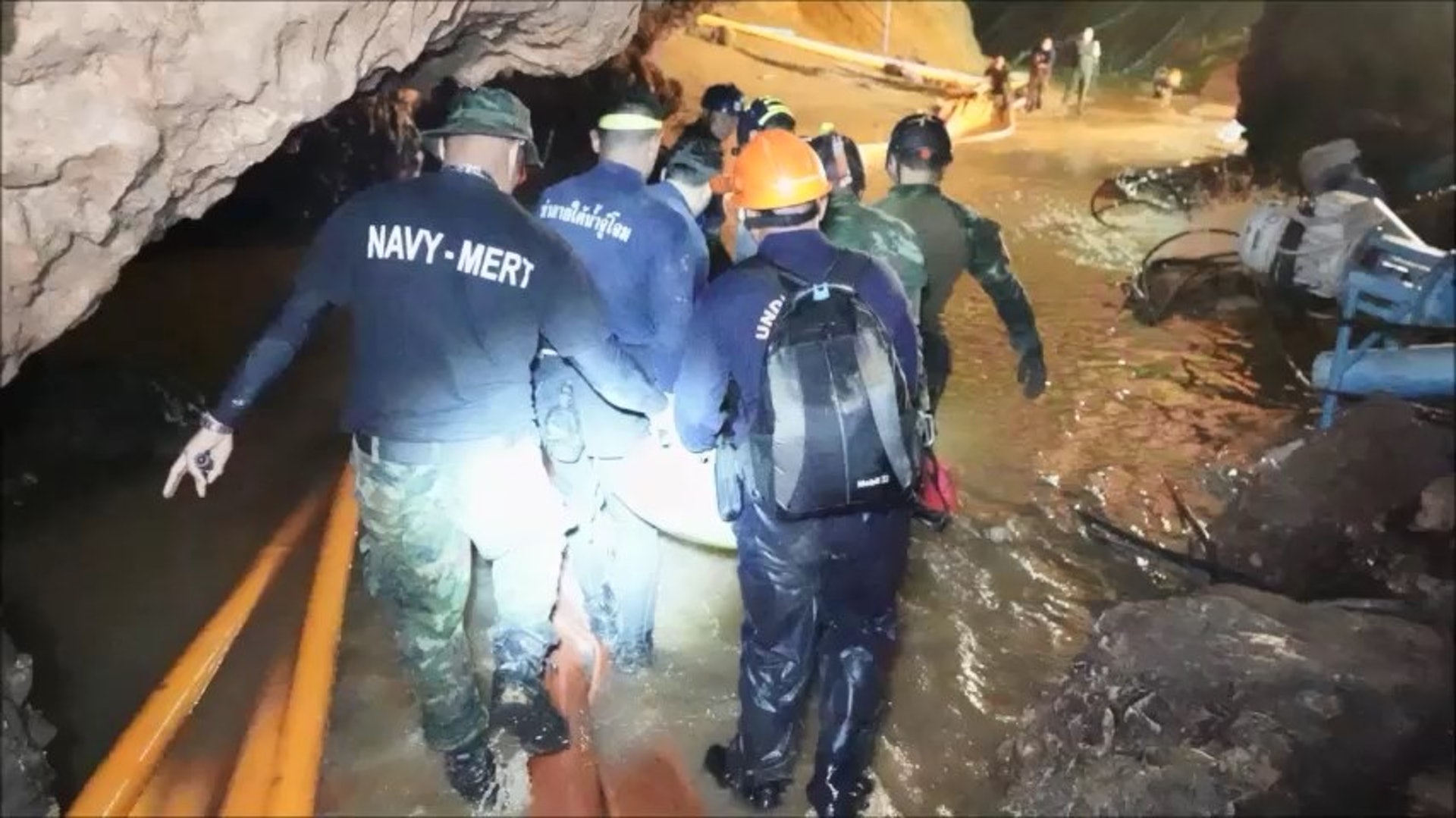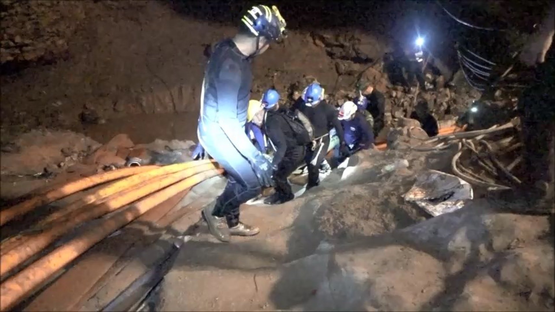 泰國少足的世紀拯救行動完滿結束,在昨日(11日)傍晚舉行的記者會上,全程約五公里的拯救片段亦告曝光。在濕滑及滿地泥濘的狹窄山洞內,面對艱辛的途程,拯救人員均精神抖擻,將被困的少年裹着,先由兩名潛水人員護着,放在擔架床上,抬着他們「潛行」出洞室。再由逾百救援人員在洞室內組成人鏈,運送出洞。期間有醫護人員沿途作檢查,多重保障少年的健康。洞穴內多條粗壯的抽水喉管,如同富有生命力的血管般,引領着大家走出生天。