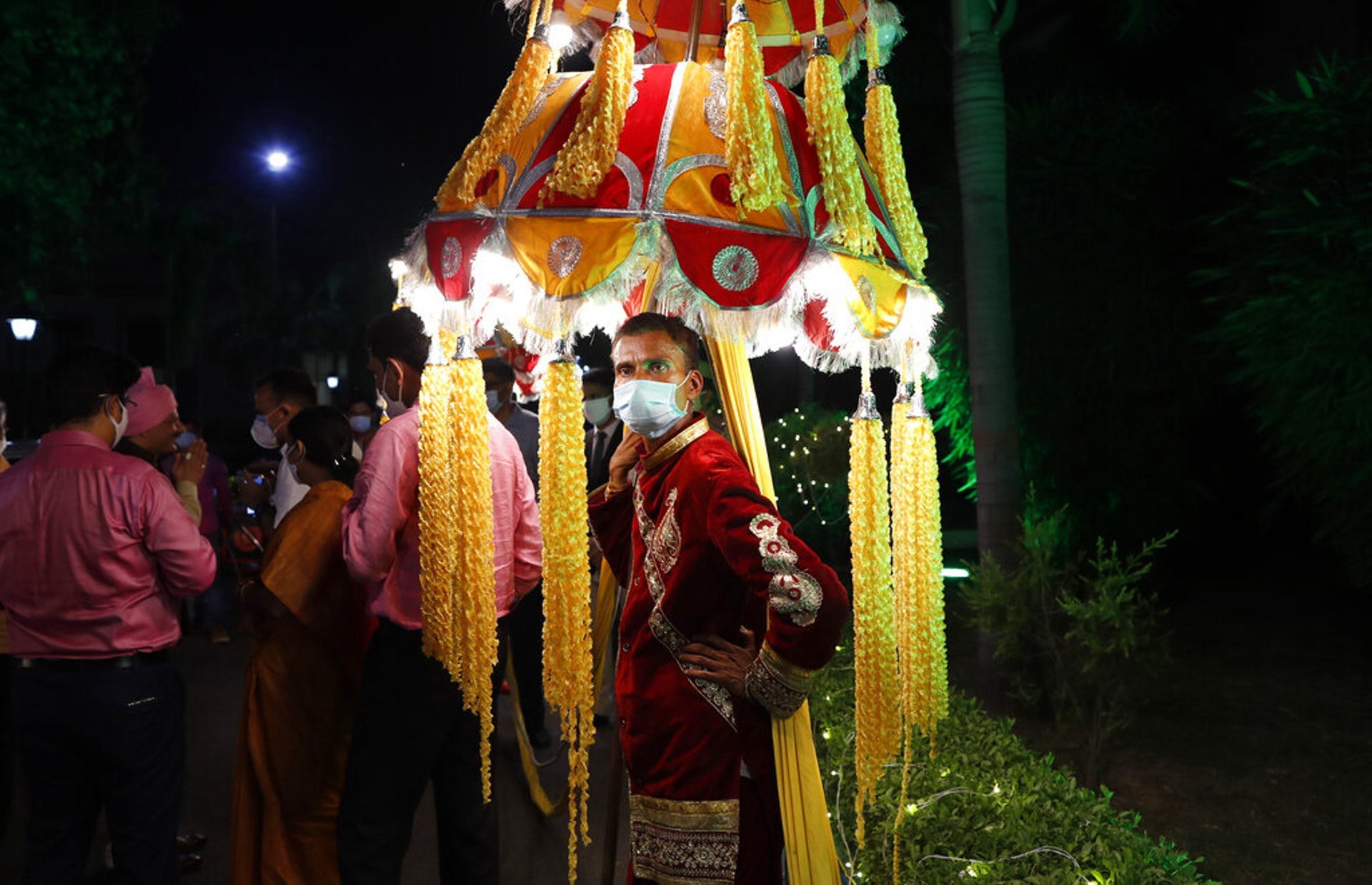 ! G) |& U8 E+ x. N. u. x+ G' _公仔箱論壇印度新冠肺炎疫情:圖為6月22日,鏡頭下於勒克瑙一個婚禮中演奏的樂隊成員。(AP)