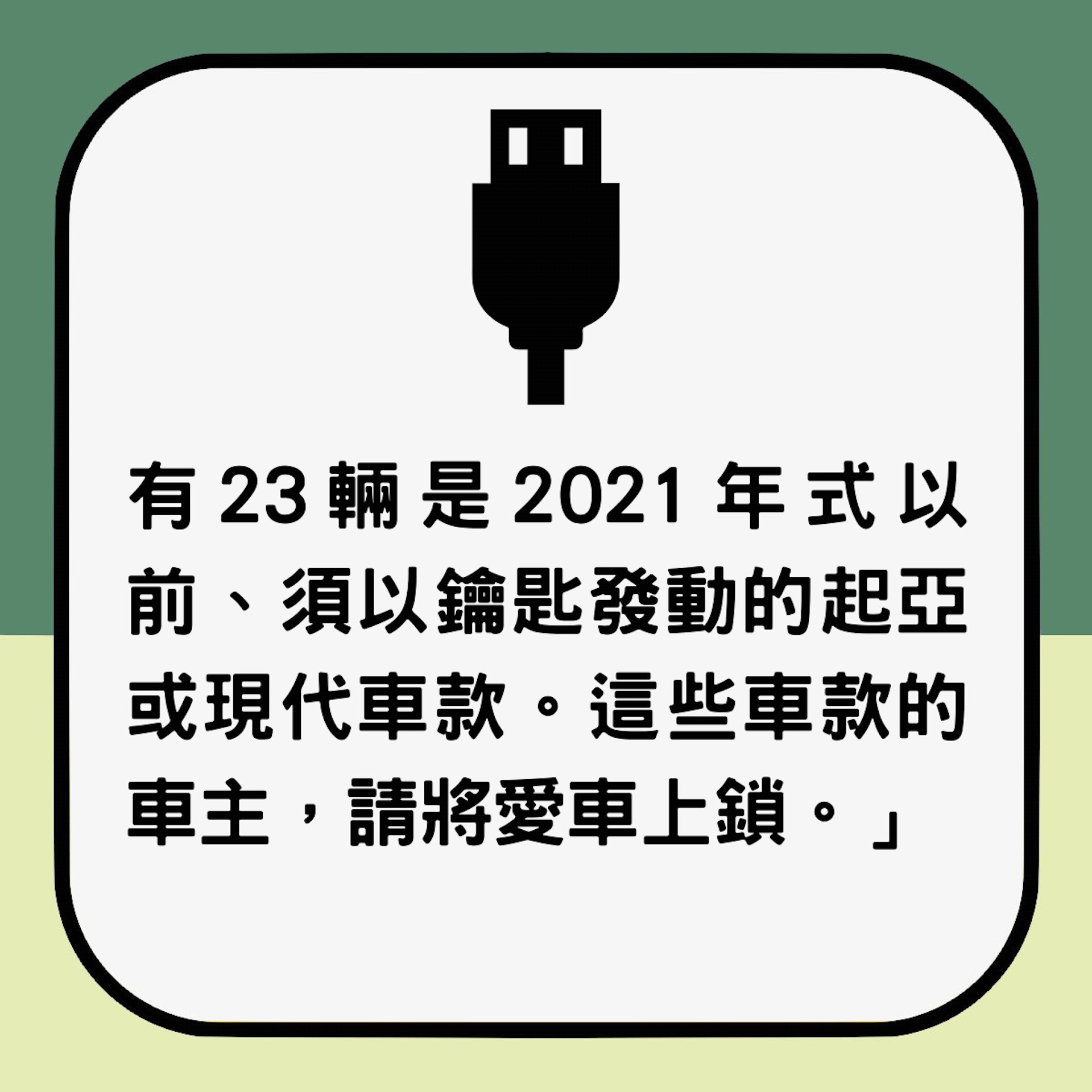 調查竊車事件的警官蘭斯說,2011~2012年式的起亞車、2015~2021年式的現代汽車,一旦方向盤柱遭破壞,「特別容易」讓竊賊將車輛發動。這些竊車案,有些甚至成為危險事件,因為竊賊把車偷到手後橫衝直撞,讓自己和路人受重傷,甚至死亡。