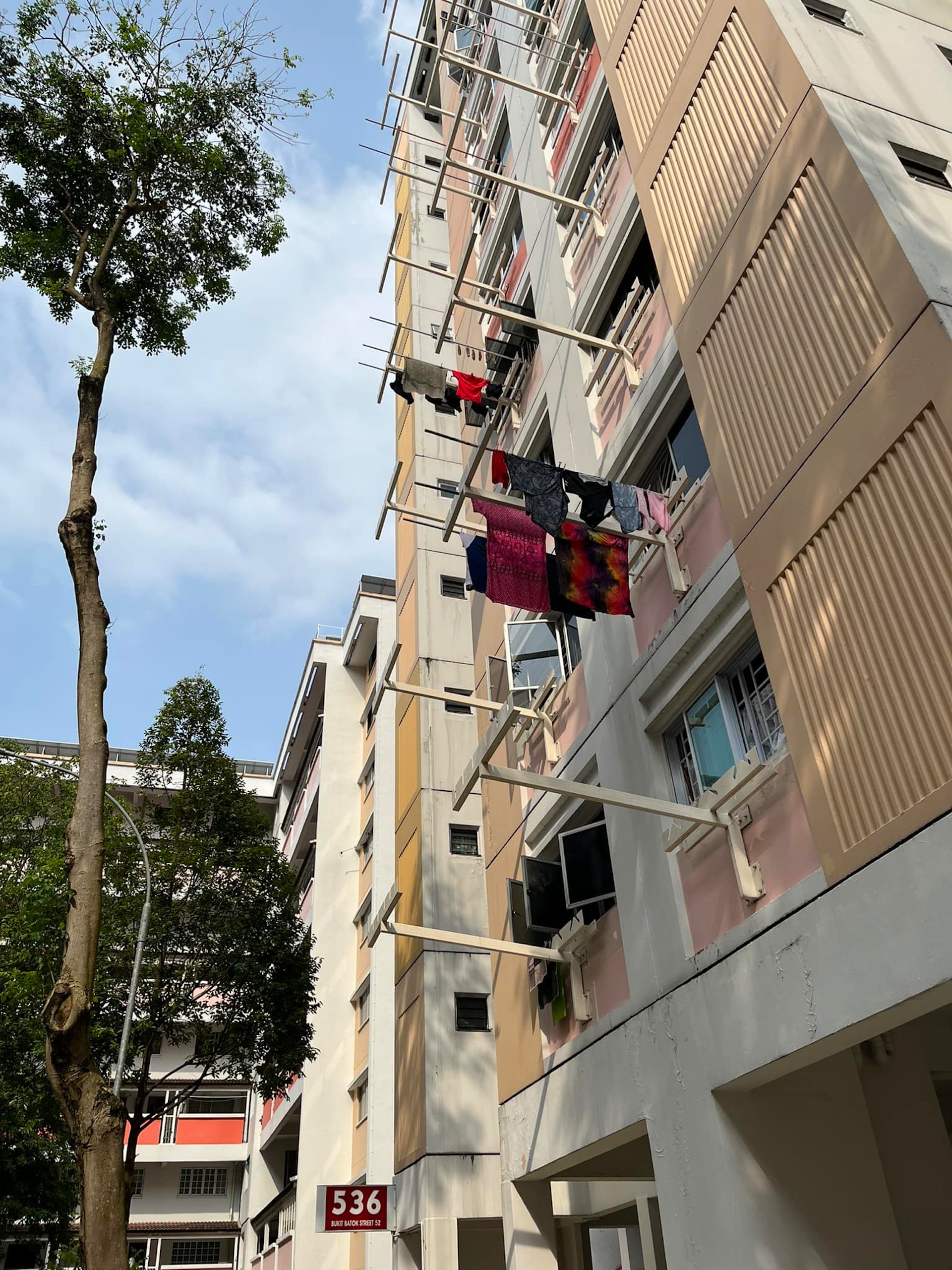 從照片可見,陳先生所居住的大樓也有其他住戶在晾衣竹上晾曬衣物,但他樓上的住戶曬的卻是豬肉。(「COMPLAINT SINGAPORE」FB圖片)