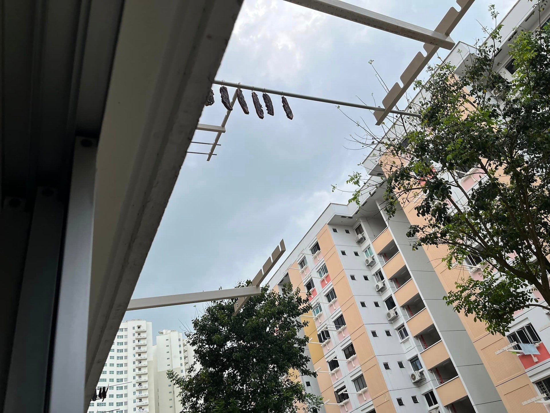 2 I. x2 t( g6 I$ ^9 s. i公仔箱論壇新加坡網民拍到,樓上的鄰居用晾衫竹曬臘肉,下方正是其他住戶的衣物。(「COMPLAINT SINGAPORE」FB圖片)6 ?& j! j- d* h