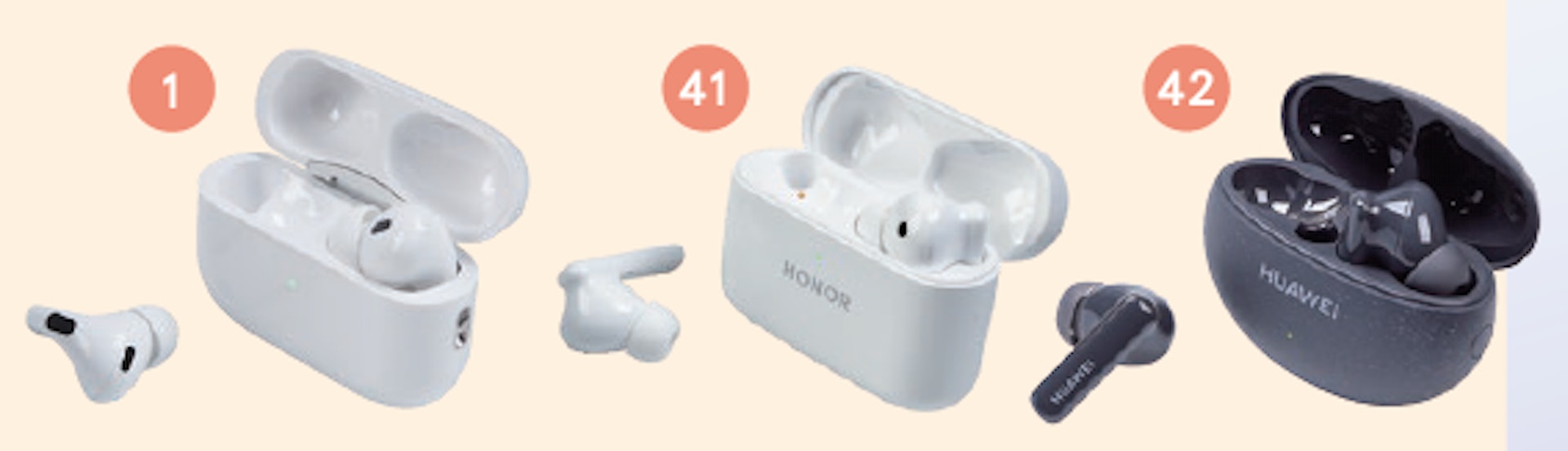 非主動式降噪型號藍牙耳機,包括: #50的Apple Airpods Gen 3 獲評滿分成首選,其次是 #51的Sennheiser CX True Wireless 及 #59的Sony WF-C500亦可考慮。(消委會提供)