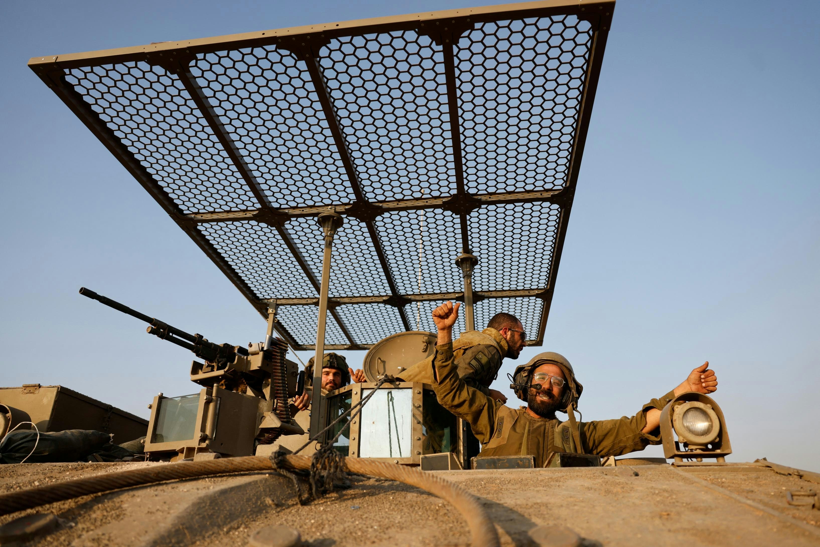 2023年12月4日,在以色列與加沙邊境附近,一名以色列士兵在坦克車隊旁邊經過。(Reuters)