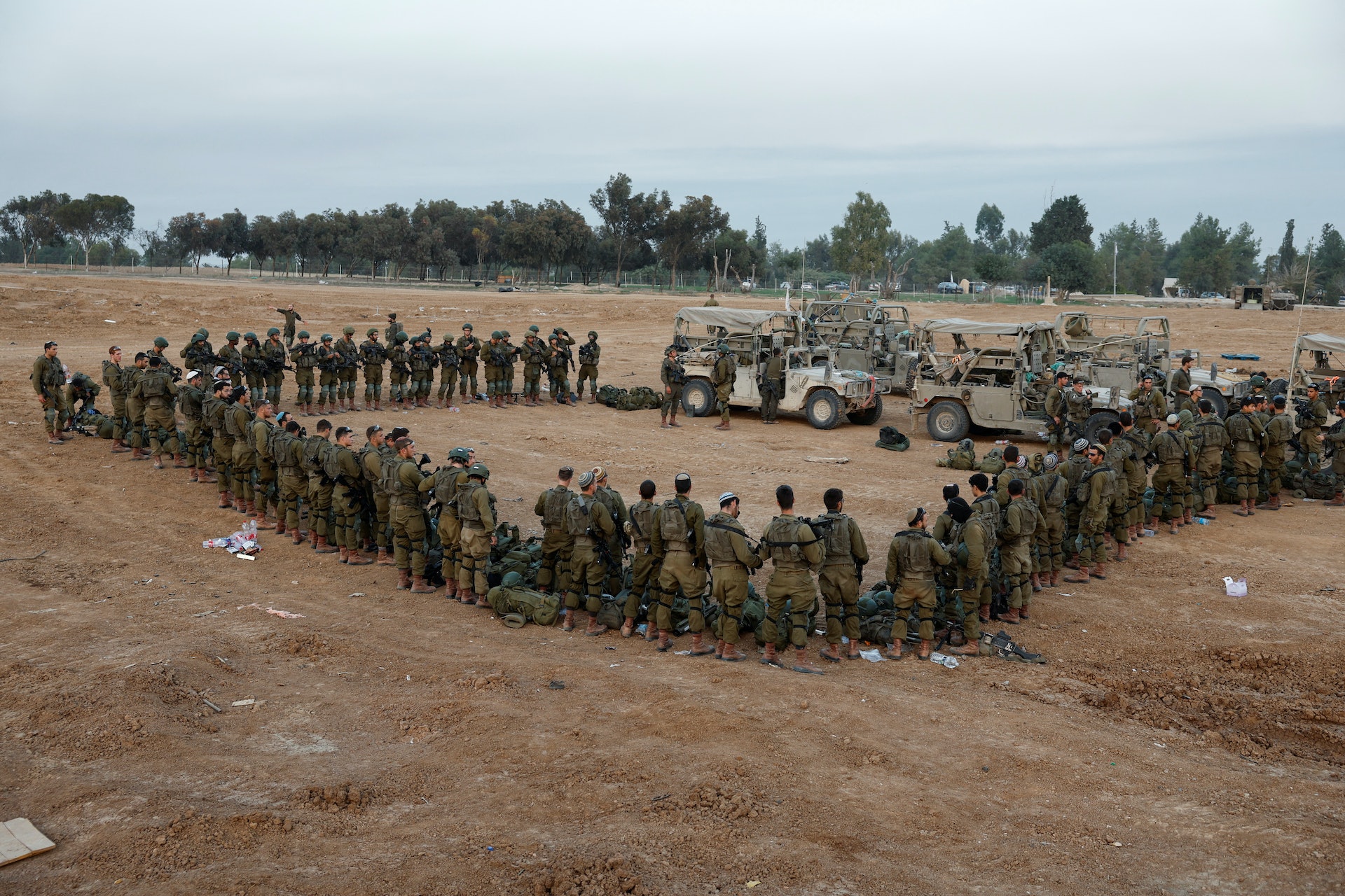 8 X7 N! O, i; c3 B2023年12月4日,在以色列與加沙邊境,多名以色列士兵集結。(Reuters)