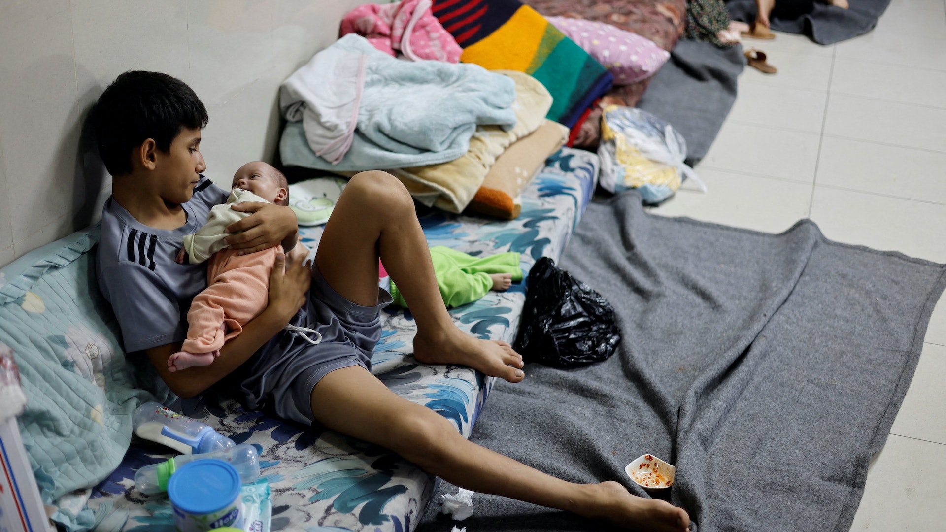 以巴衝突:2023年10月23日,一名在以色列襲擊中受傷的巴勒斯坦男子和他的兒子,坐在加沙城希法醫院的地板上。(Reuters)
