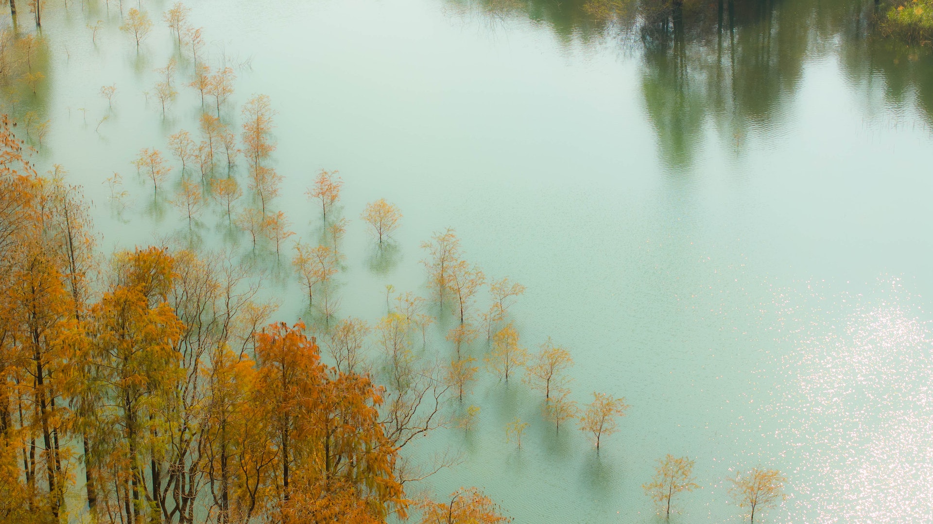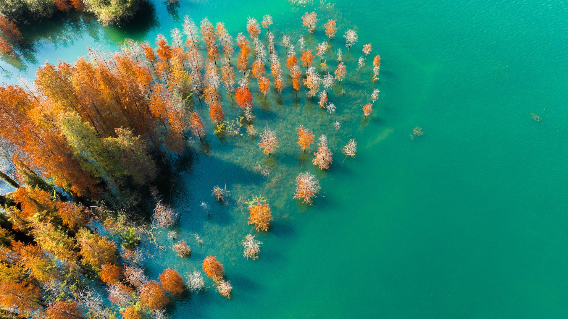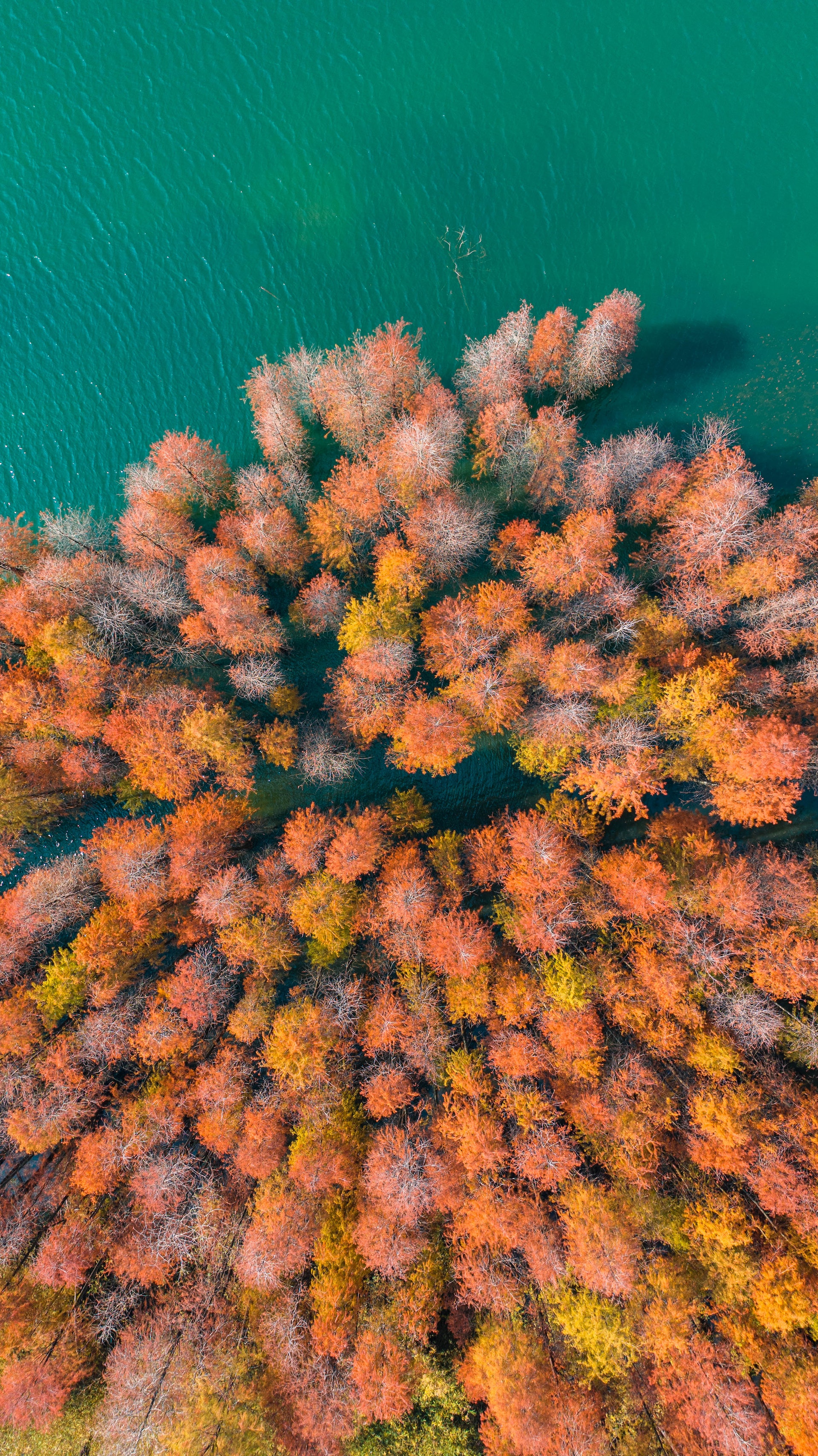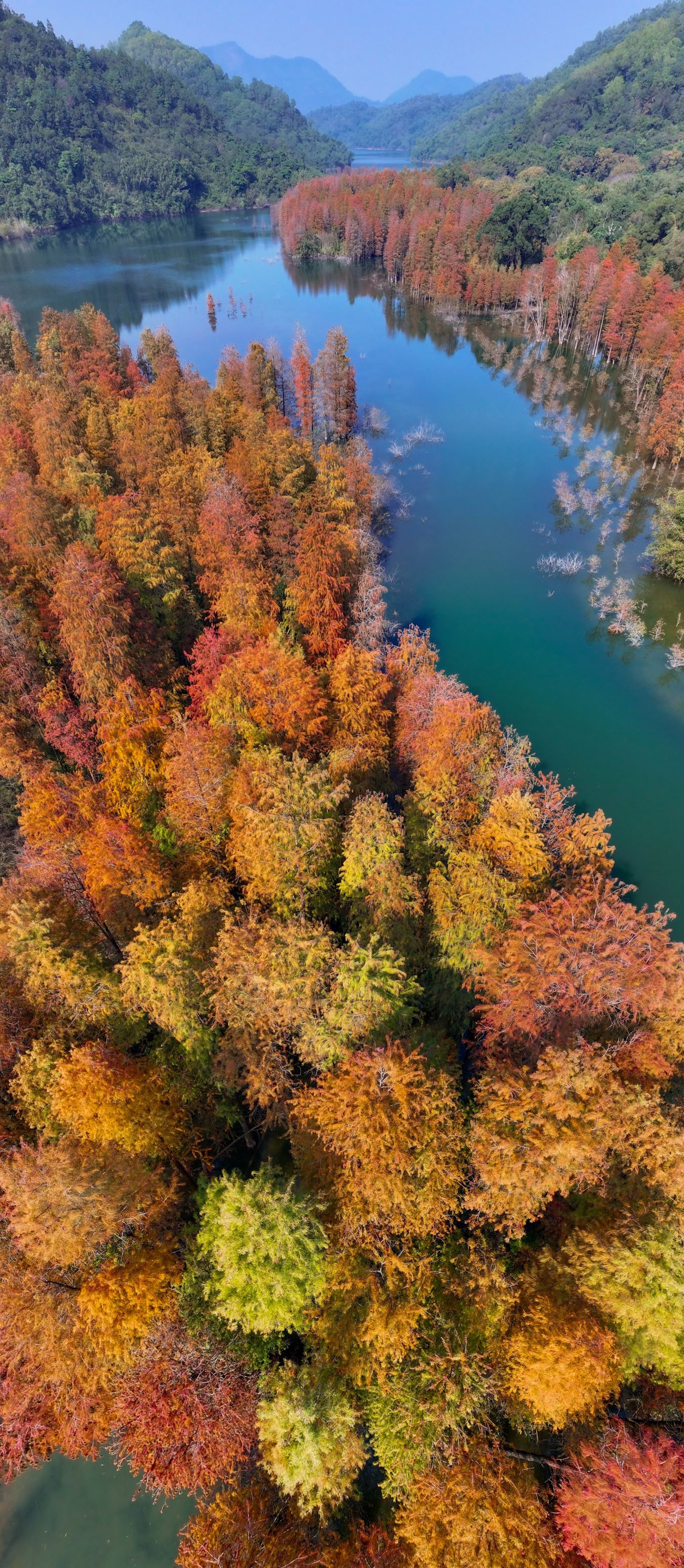 從空中俯瞰,大自然在這裏把所有色彩都運用得恰到好處,漫山彩林呈現出五彩繽紛的旖旎風光。空拍視角下的落葉杉宛如一朵朵綻放的鮮花,與藍天碧水相映成趣,青、黃、橙、紅等交織爭艷,恰似人間仙境。