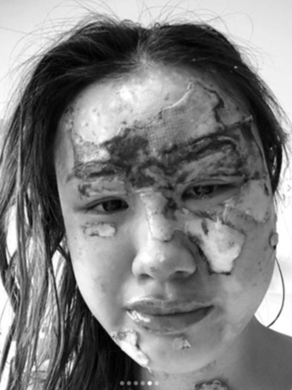 : e, B/ E* Y) a( @) M% }2 m }# }意外導致她臉部嚴重燒傷,大半張臉幾乎全毀。(IG@charlenechew)