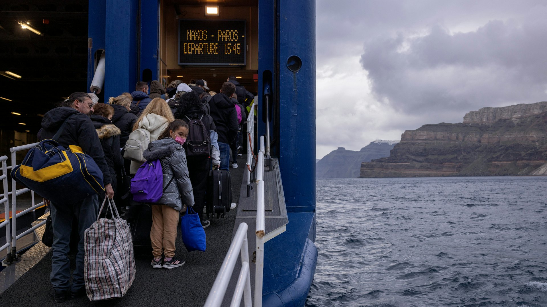 - e. G5 J7 j, q8 n! G. F( ?- k! n公仔箱論壇2025年2月4日,希臘聖托里尼島(Santorini)地震頻繁,人們登上前往比雷埃夫斯(Piraeus)的渡輪。(Piraeus)