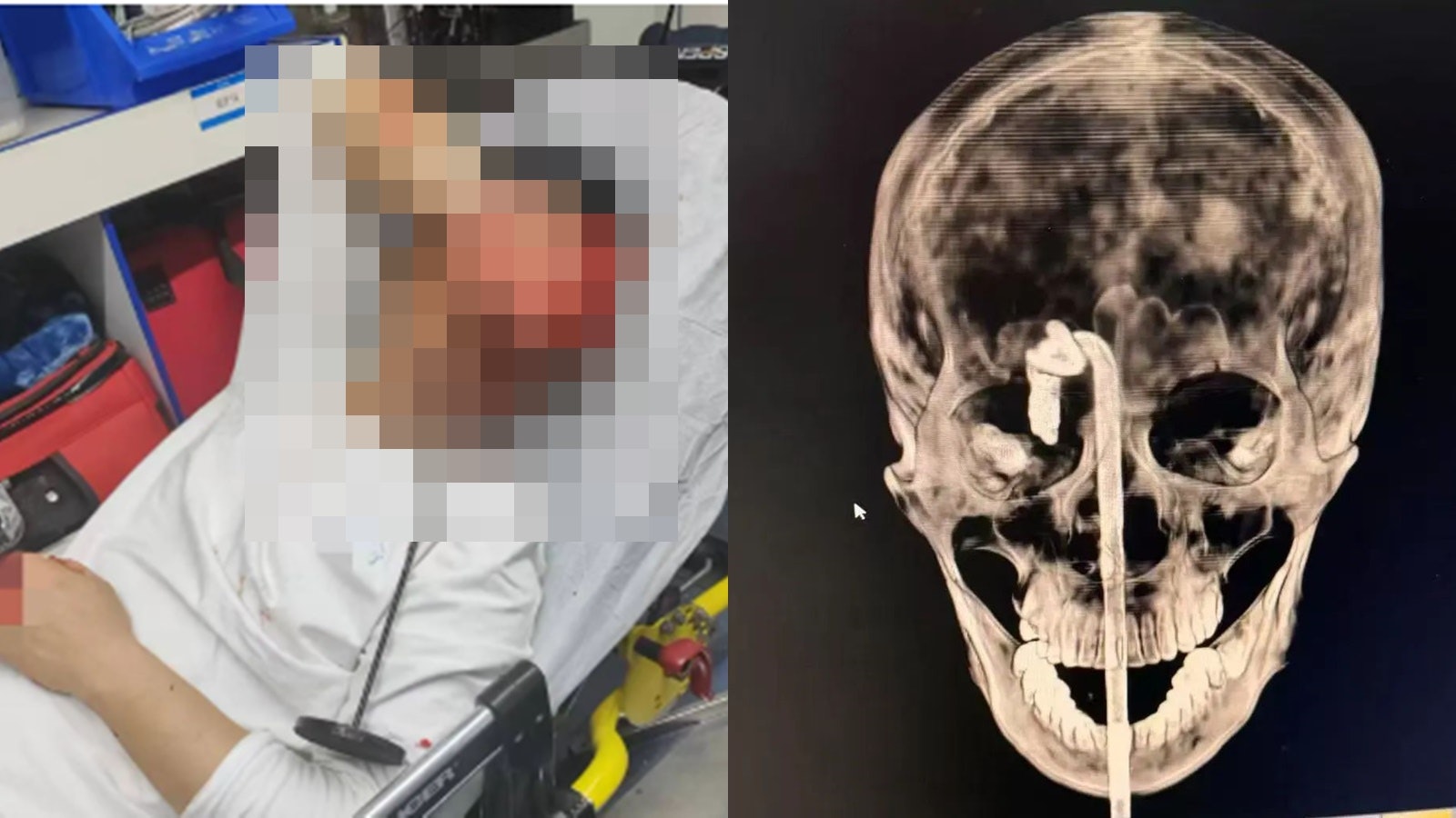 近日,深圳一名男子凌晨聚餐後,因醉酒向前摔去,正好摔在桌上擺放的長桿黑色金屬便簽夾上,長約42cm金屬桿從口腔插入,經過鼻子、眼窩,一路直直杵進大腦。