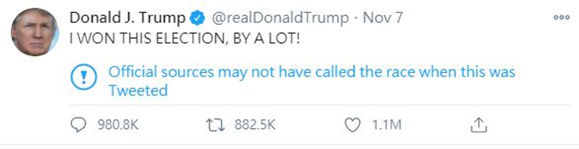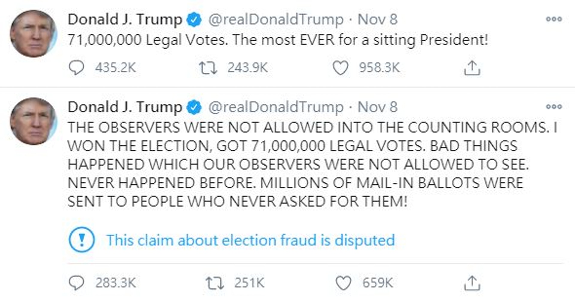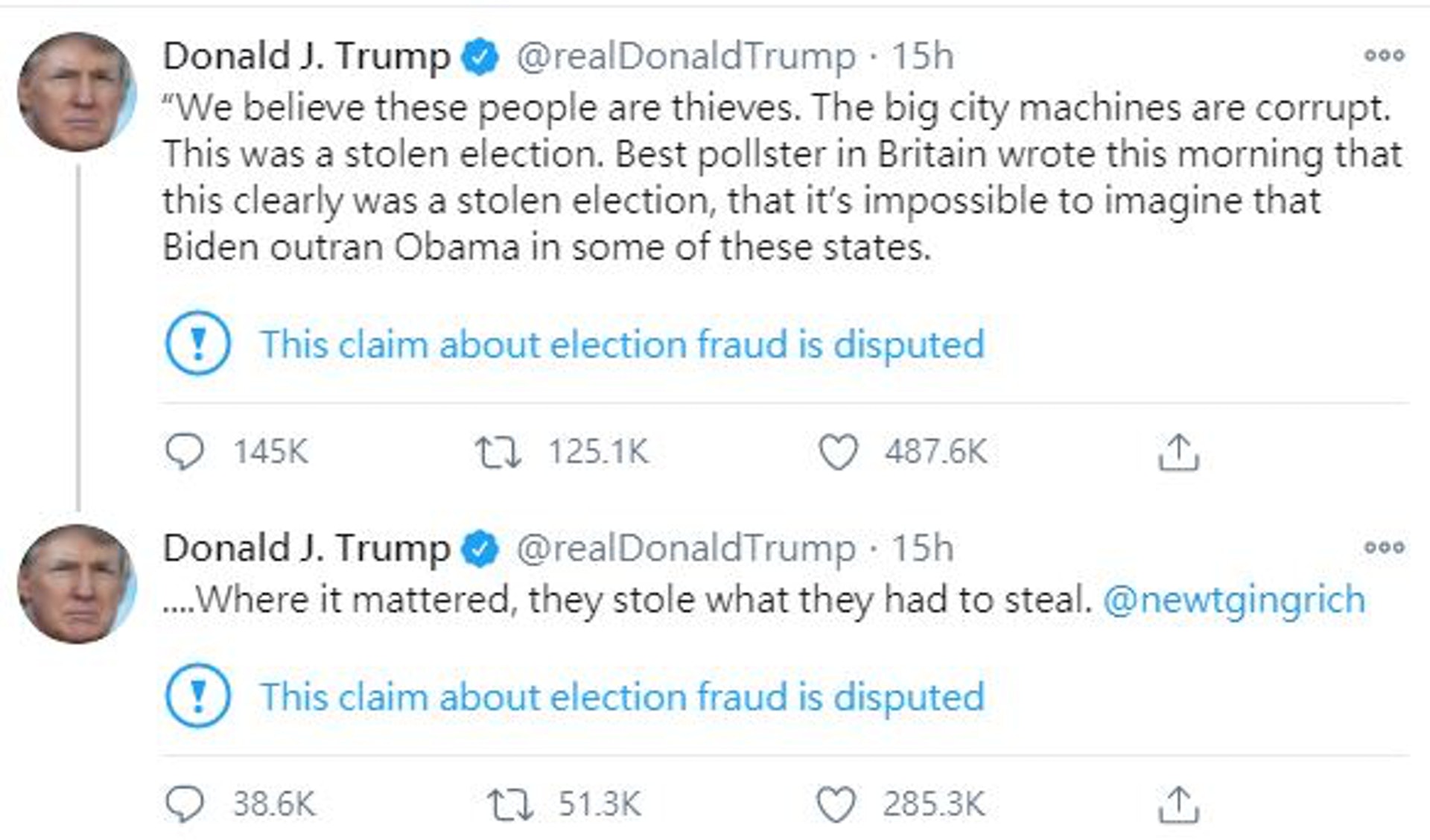 特朗普近日不停就選舉結果在Twitter發言,包括「STOP THE COUNT」(停止點票),部分被加上標示甚至屏蔽(realDonaldTrump/Twitter擷圖)