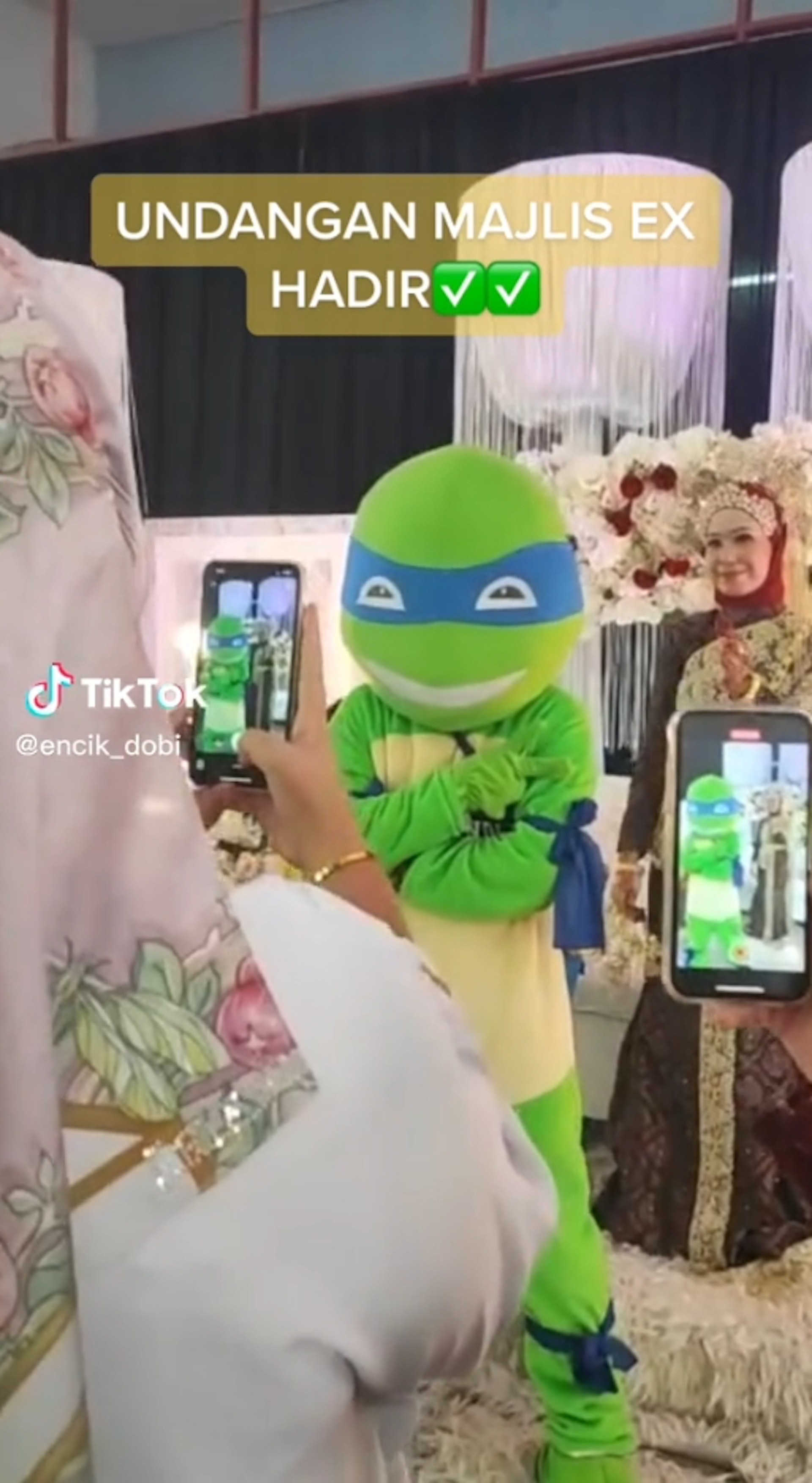 一名馬來西亞的男子與女友愛情長跑8年,但最後不幸以分手收場,沒多久後前女友嫁給了另外一人,他雖然感到十分悲傷,卻還是選擇去參加婚禮,不過他沒有去大鬧會場,而是穿上「忍者龜」布偶裝,以特別的方式為這天留下紀念。(TikTok@encik_dobi)