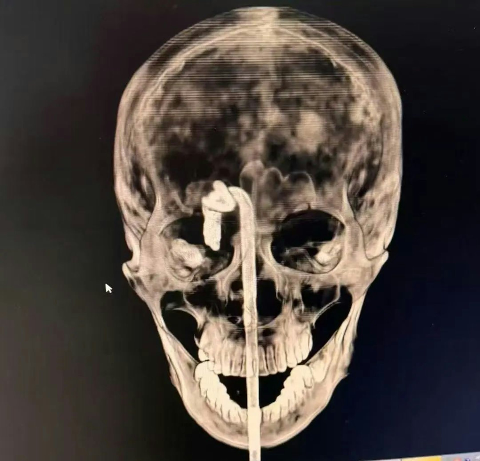 緊急送醫後,經過長達10小時的手術,男子腦內的金屬桿被完整取出。據介紹,該金屬桿從嘴巴到顱內的長度,就超過了15厘米。 z) P# b$ d( Z6 b