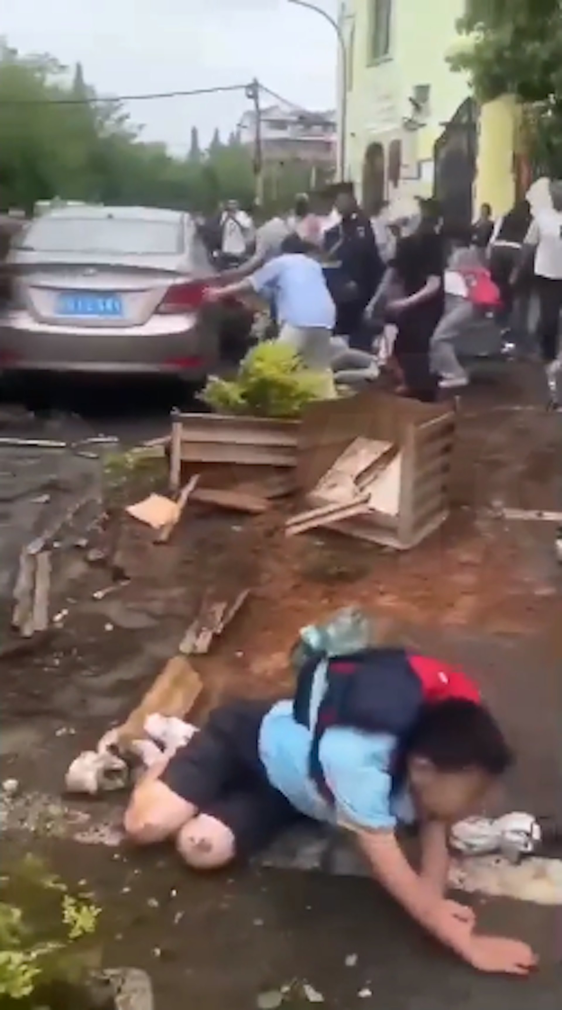 家長幼童倒地哀嚎。家長幼童倒地哀嚎。眾人抬車救人。(影片截圖)- D2 T, U: O" U: T- v5 K# O! Q( T