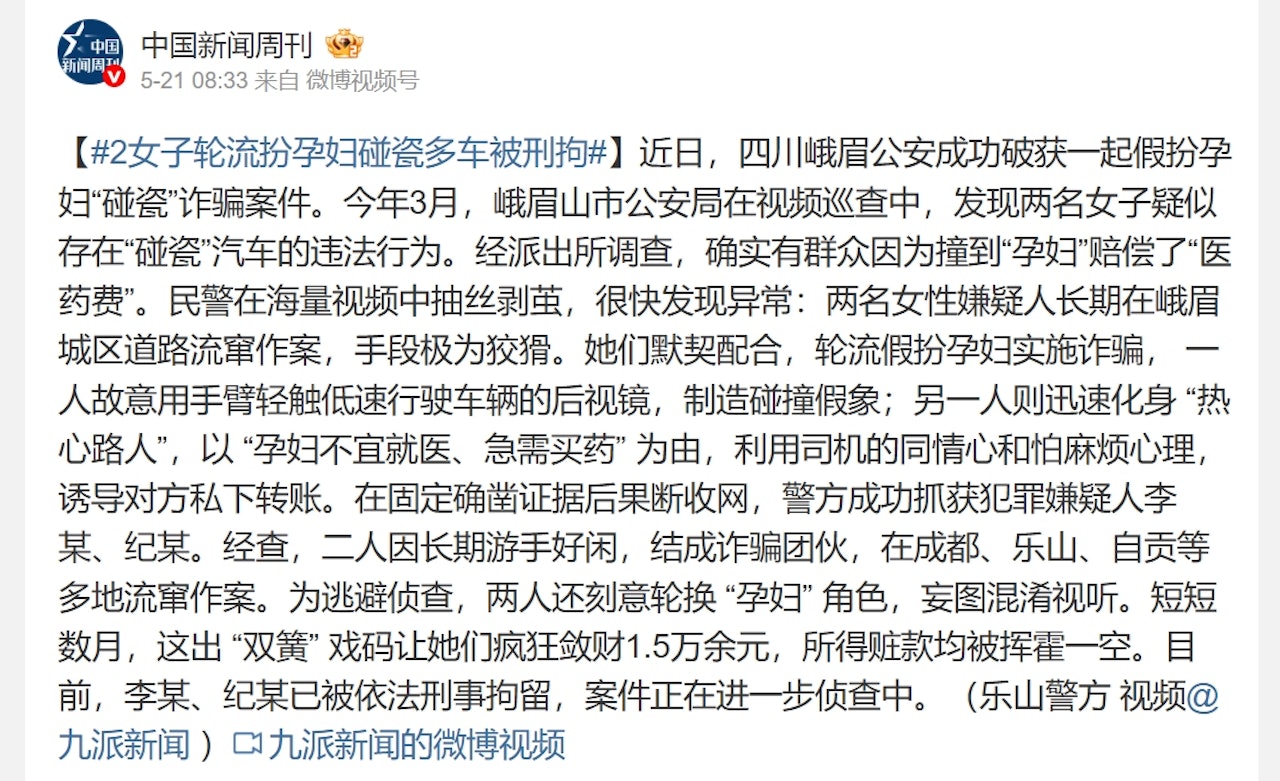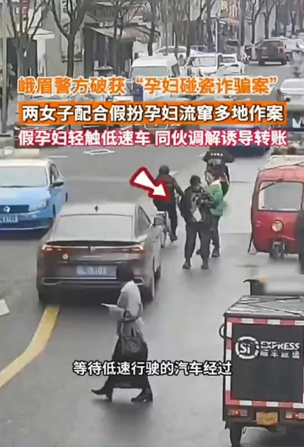 四川省峨眉山市公安局今年3月發現,兩名女性嫌疑人長期在峨眉城區道路作案,「手段極為狡猾」。據稱,她們默契配合,輪流假扮孕婦實施詐騙。一人故意用手臂輕觸低速行駛車輛的後照鏡,製造碰撞假象。