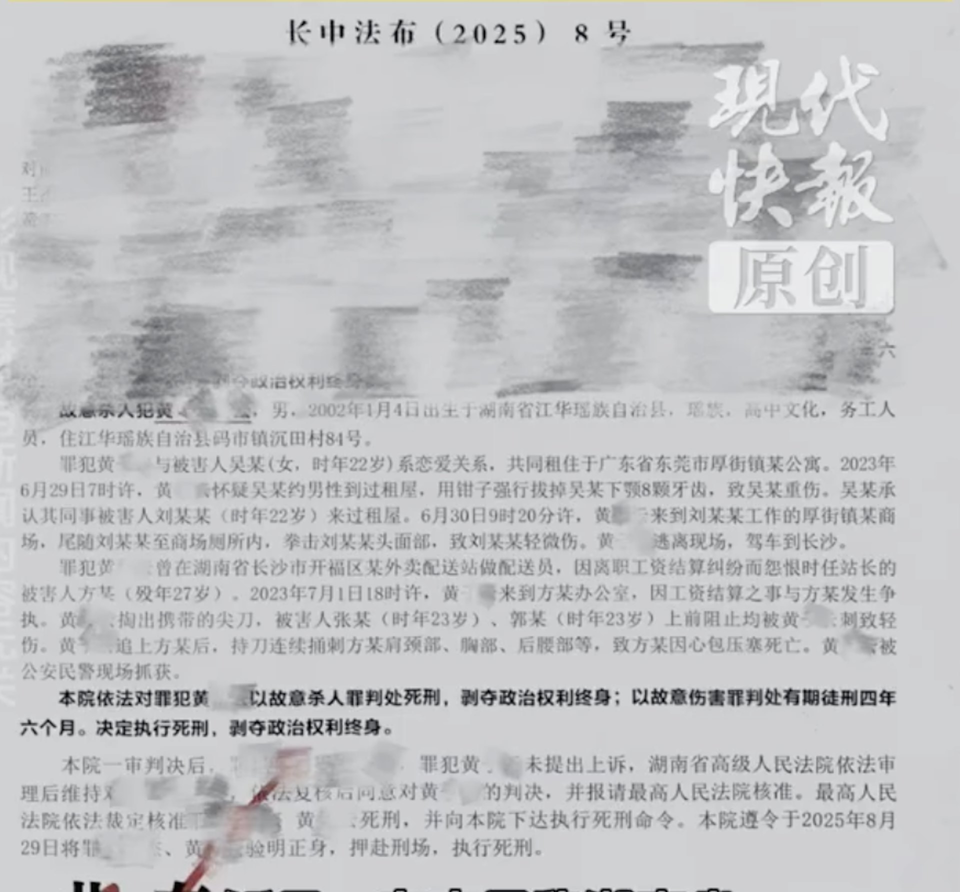 最高人民法院依法裁定核准罪犯黃某雲死刑,並向長沙市中級人民法院下達執行死刑命令。長沙市中級人民法院遵令於2025年8月29日將罪犯黃某雲驗明正身,押赴刑場,執行死刑。