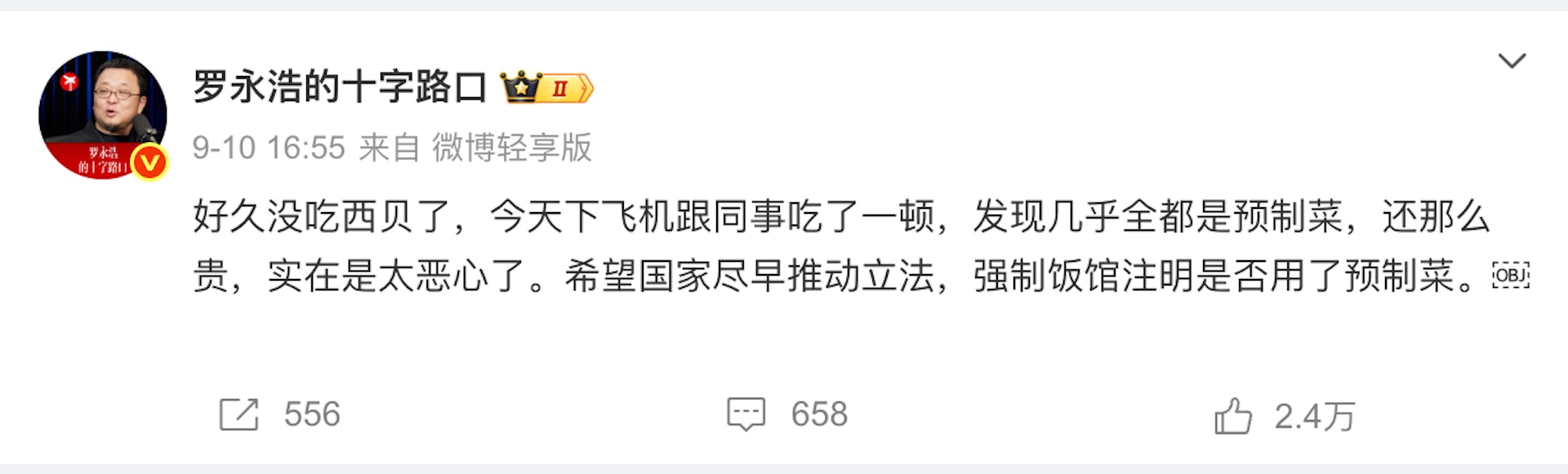 $ _: n; h" ]! w2 `9 u% r# I9月10日,羅永浩在微博發文稱,西貝「幾乎全是預製菜」。(微博@羅永浩的十字路口)os.tvboxnow.com' [: e8 D/ D4 V- r+ S4 N