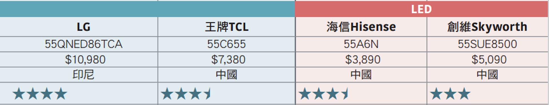$ S# f' O, U; F. A! C公仔箱論壇8、LED:海信Hisense 55A6N;售價:$3,890;聲稱原產地:中國;整體評分:3星半