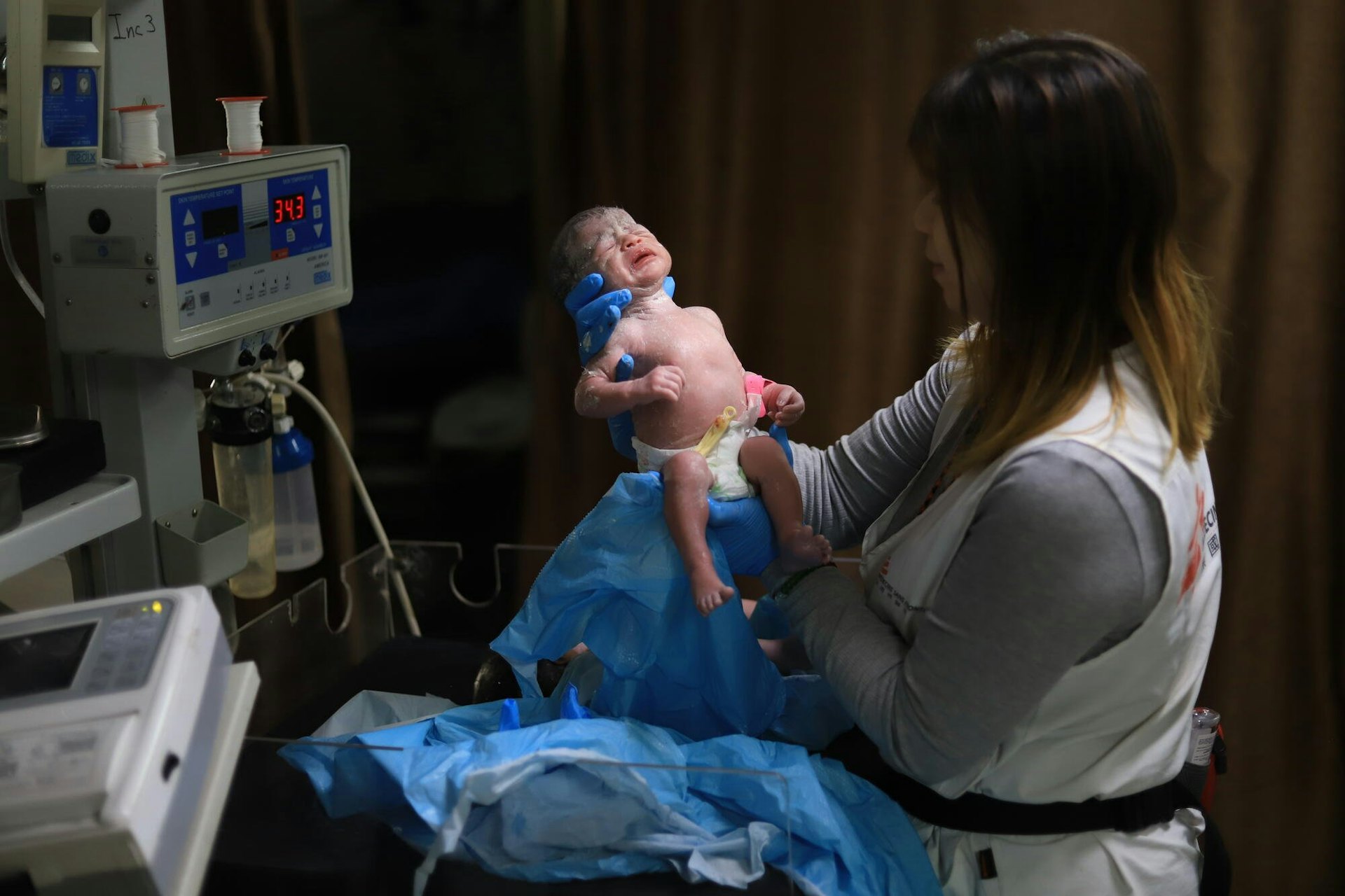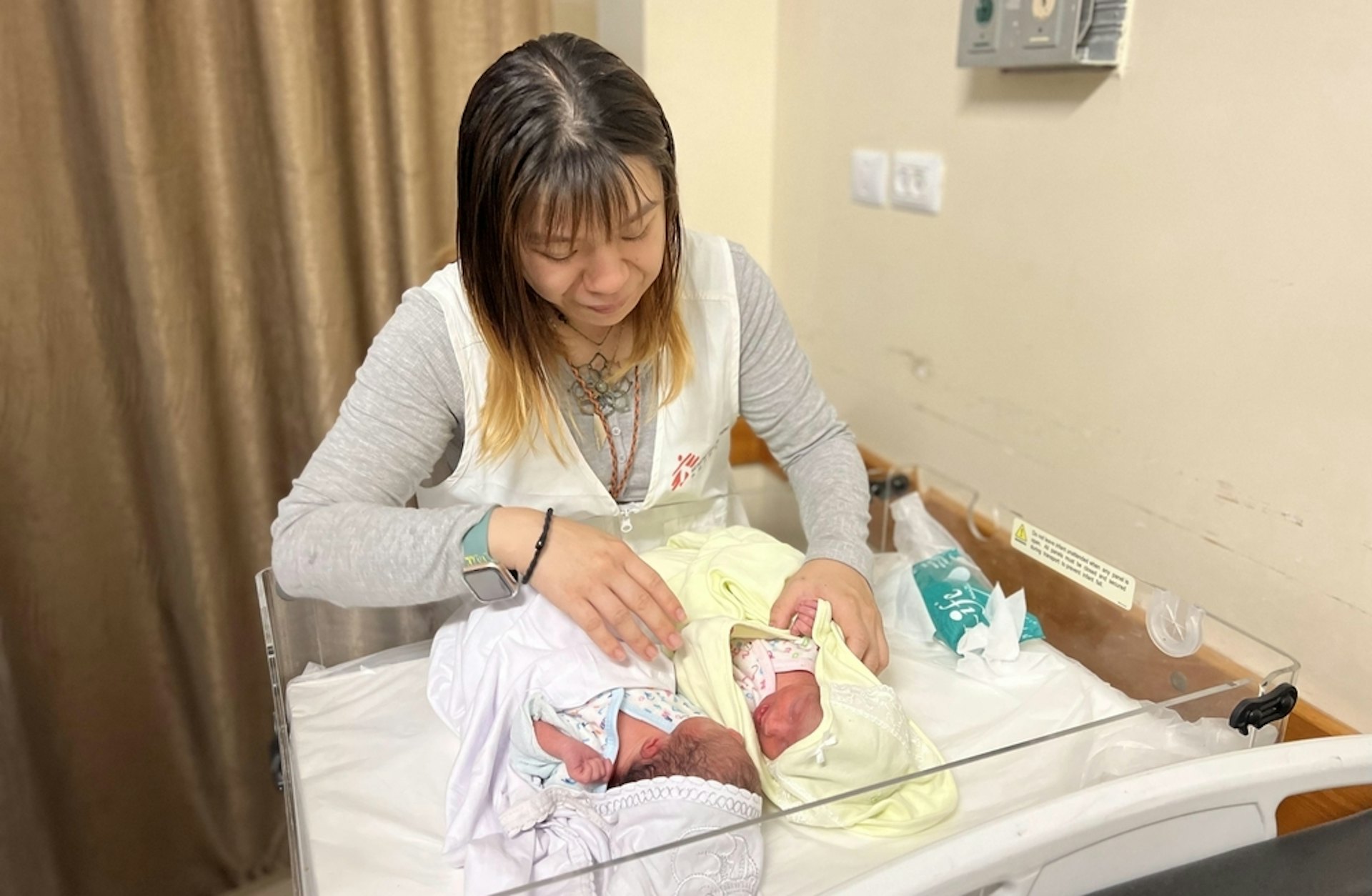 & e! ^; `3 {+ t$ a, z$ V. `8 N( aos.tvboxnow.com無國界醫生助產經理和護士蘇衍霈 (Krystal)在加沙南部的納賽爾(Nasser)醫院為兩名新生兒提供護理。(無國界醫生組織提供)- u! {8 P# Q, F S! ]
