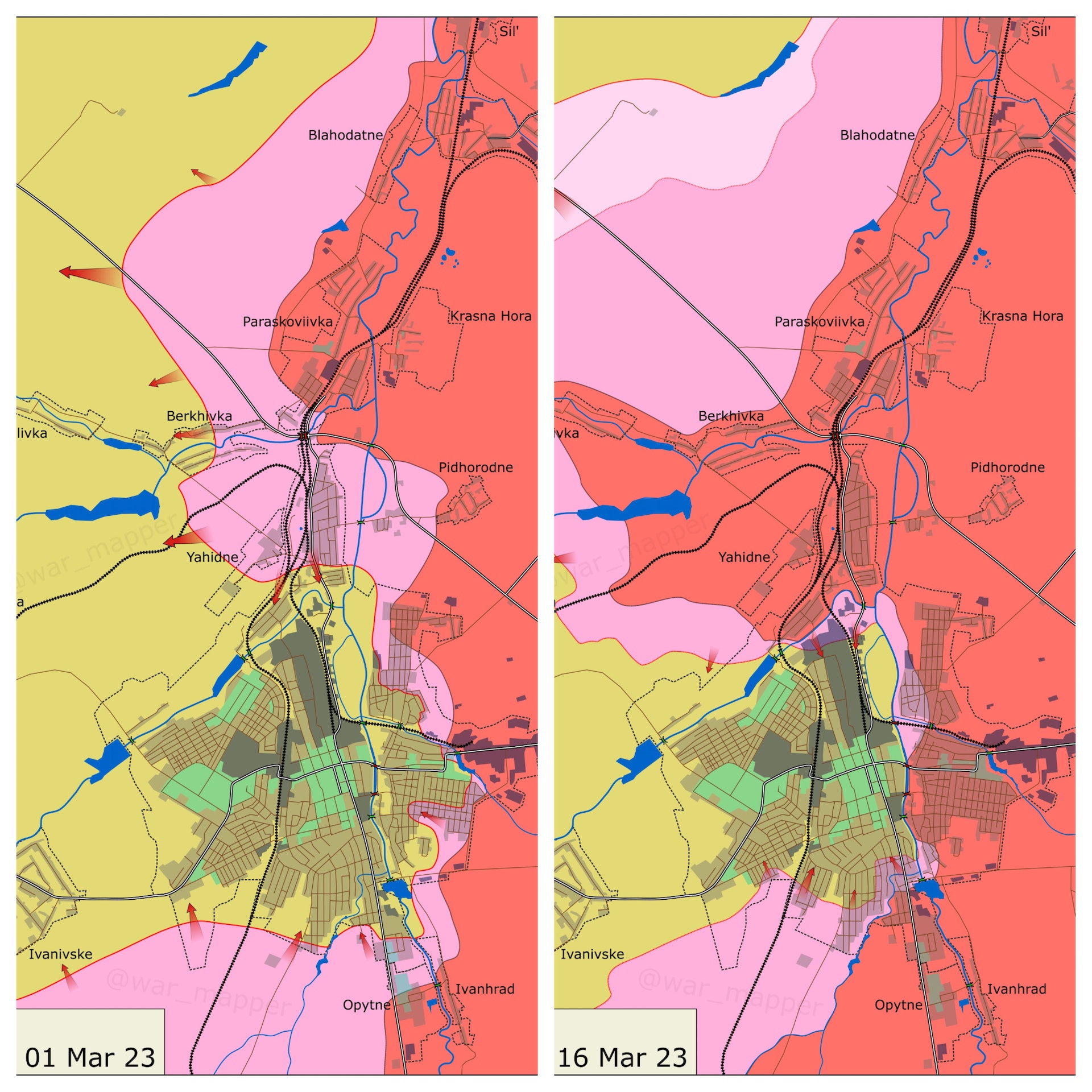 / N* p* ^% K, T; W$ A0 wtvb now,tvbnow,bttvb即將落入俄軍手中的巴赫穆特。3月1日與3月16日的俄軍包圍形勢比對。(Twitter@War_Mapper)