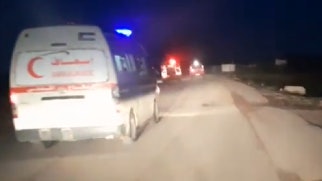 影片顯示,一輛紅色消防車和救護車在夜間行駛,救護車行駛時,前燈開啟,警示燈閃爍。背景音則是不斷響起的槍聲。