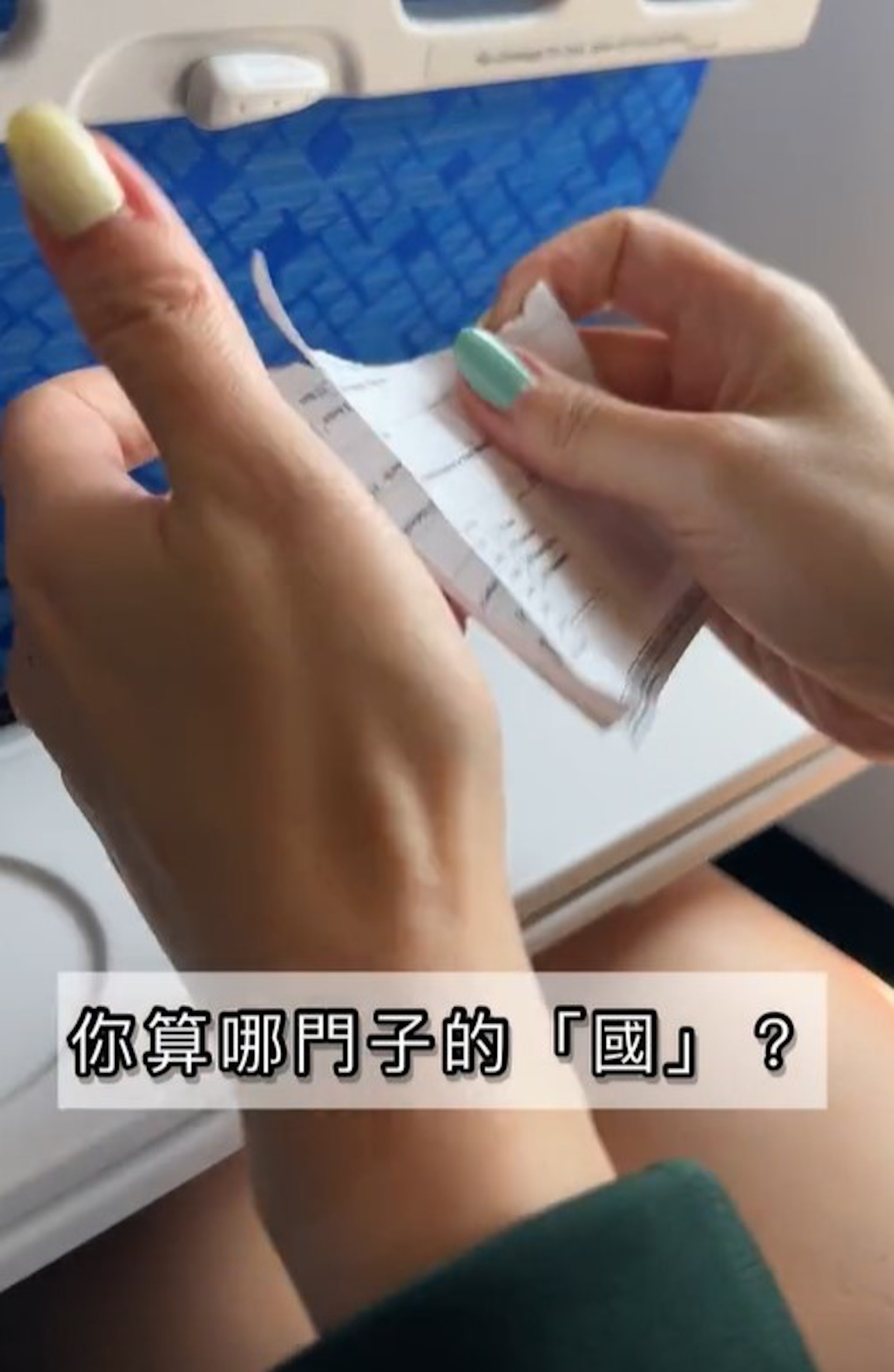 % o4 x' h# {. W6 ] l有內地女子早年移居香港並持有香港護照,而日前往台灣旅遊時,在機上獲派入國登記表,看見「入國」兩字深感不滿,怒言「你算哪門子的『國』」,更即場將登記表撕毀。(macypig@抖音截圖)