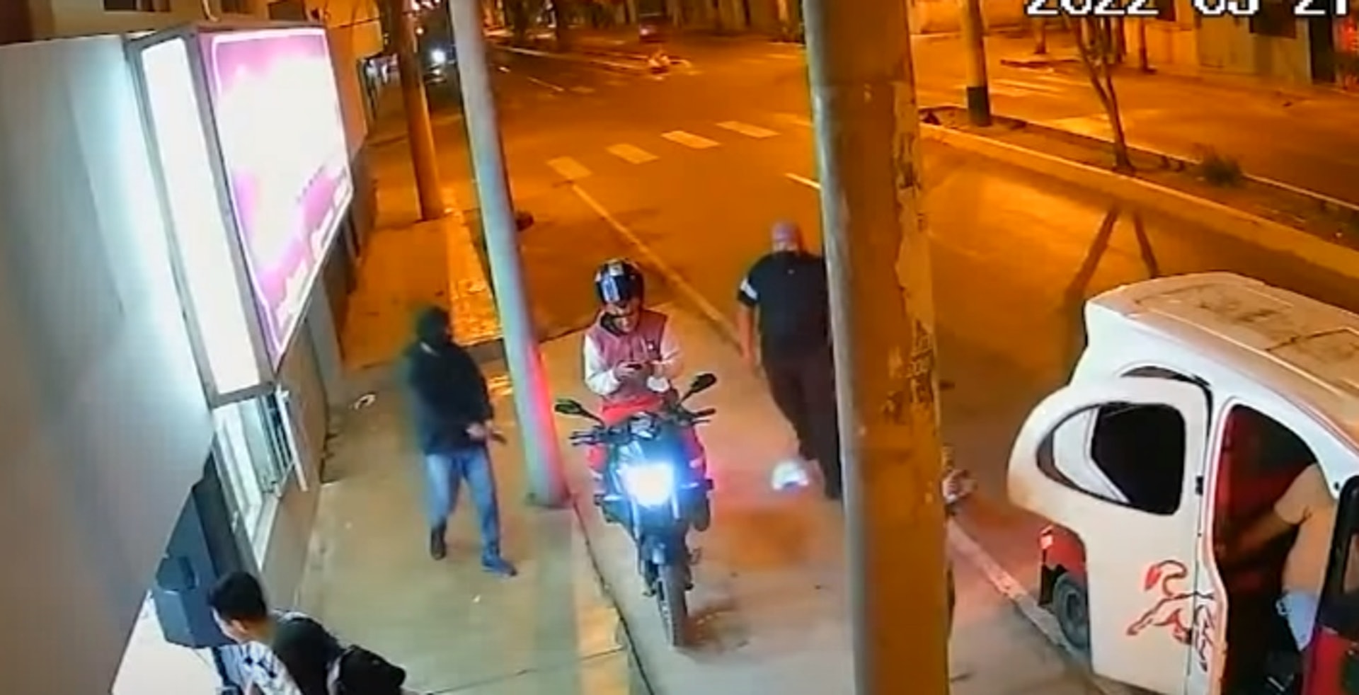 27歲男子梅薩與同黨於秘魯瓦喬市持槍搶劫1名外賣送餐員,同黨掏出手槍威脅,梅薩則強行取下送餐員頭上所戴的安全帽。(閉路電視片段截圖)tvb now,tvbnow,bttvb6 D, |4 B% E j$ V# e: J' L