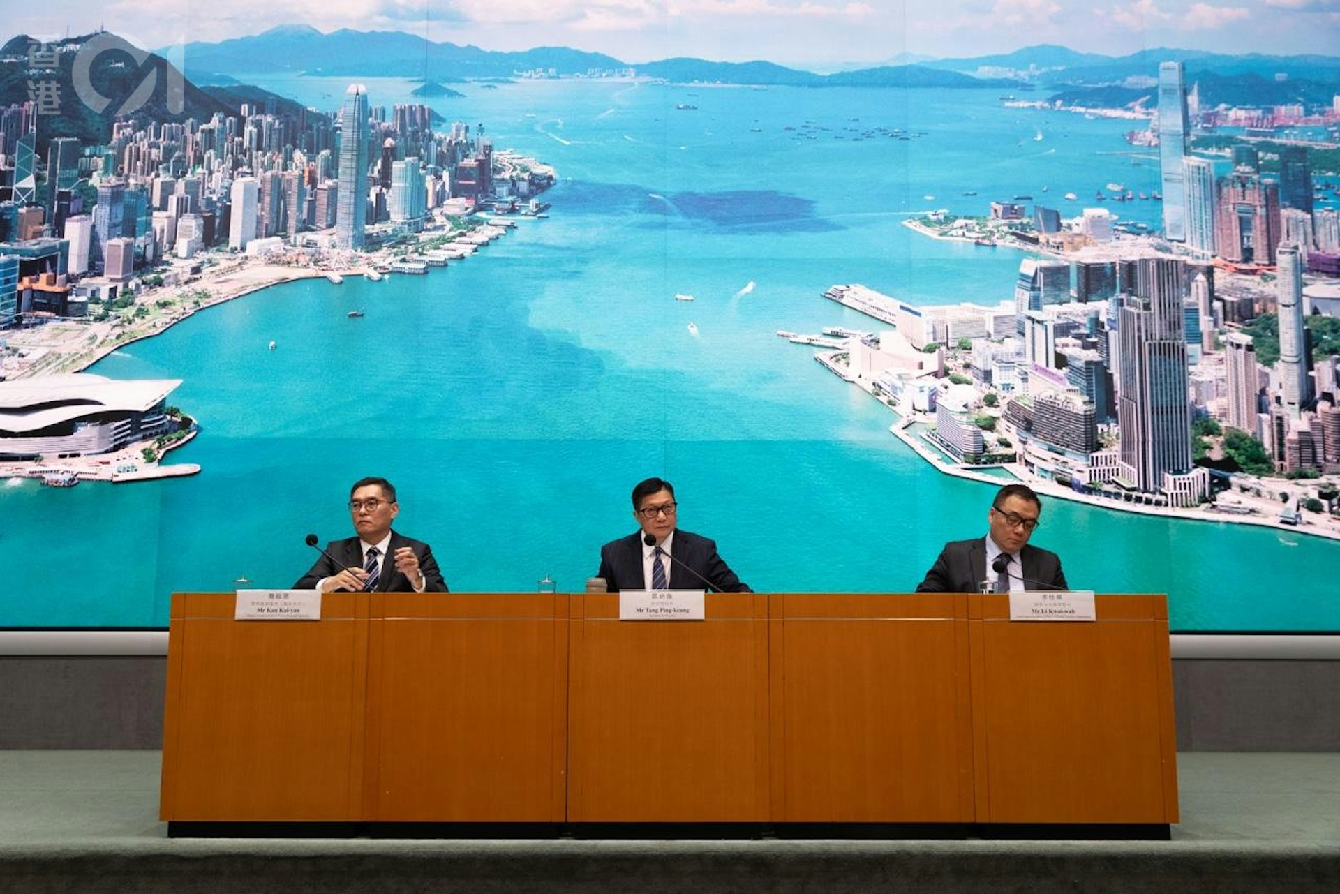 保安局局長鄧炳強(右)12月24日與警務處副處長(國家安全)簡啟恩(中)、警務處國家安全處總警司李桂華(左)在政總見記者。(梁鵬威攝)
