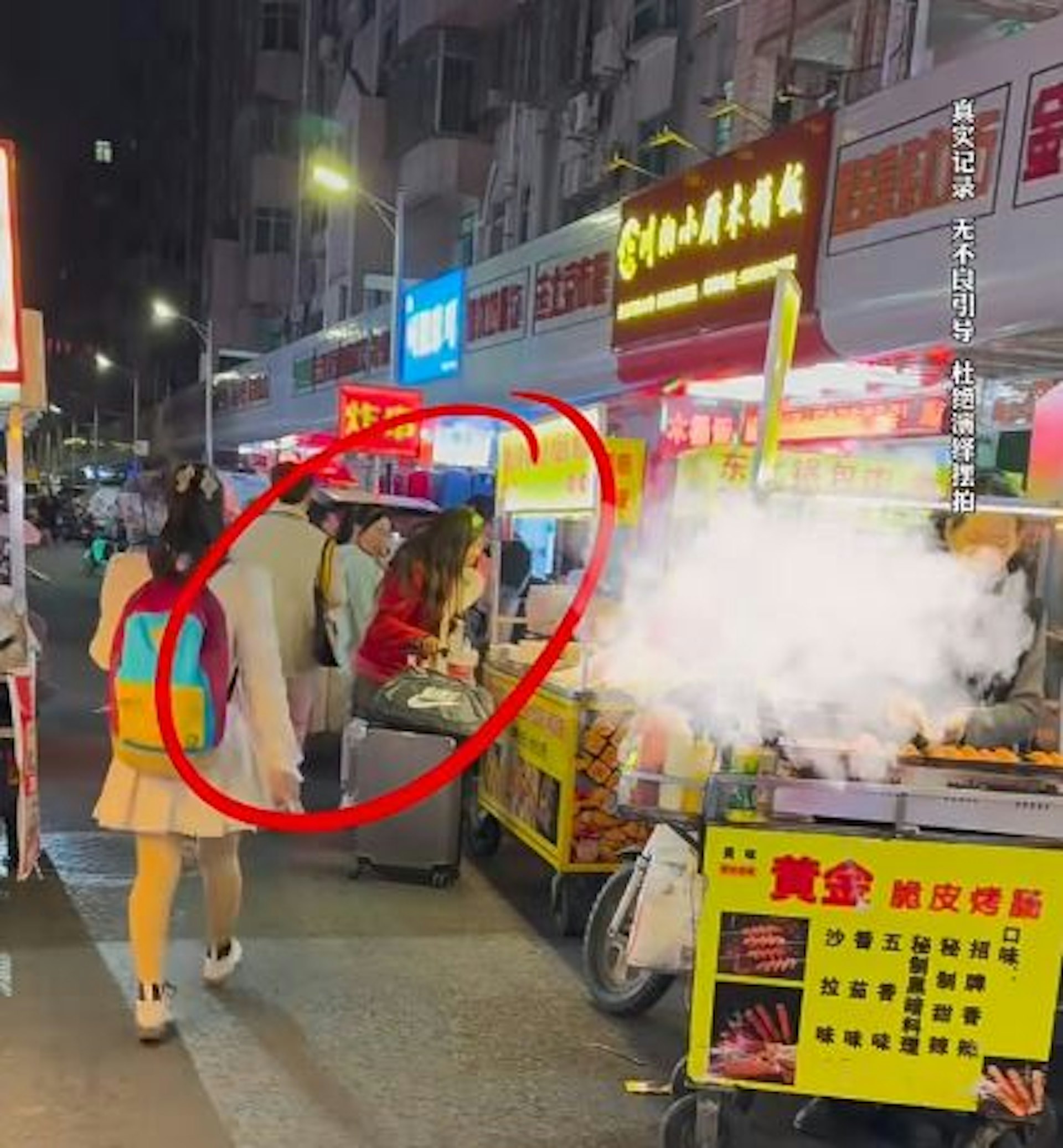 - a1 ~3 t8 ?7 E1 Y女子披頭散髮拖著行李箱等,欲在小食檔前欲購買食物。(影片截圖)