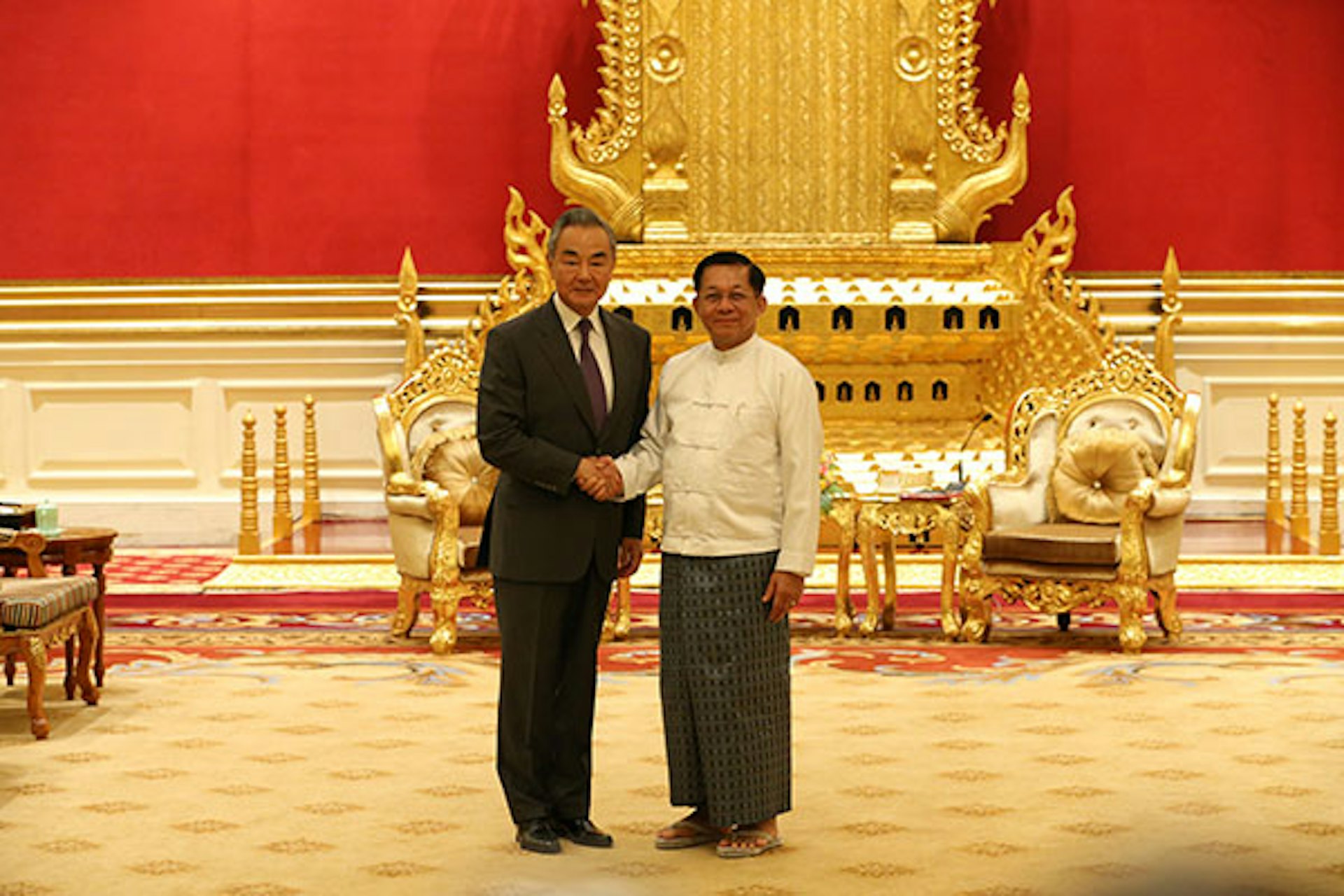 $ T. n) \5 R3 W5 s$ S3 o; F公仔箱論壇2024年8月14日,緬甸領導人敏昂萊在內比都會見中共中央政治局委員、外交部長王毅。(中國外交部圖片)