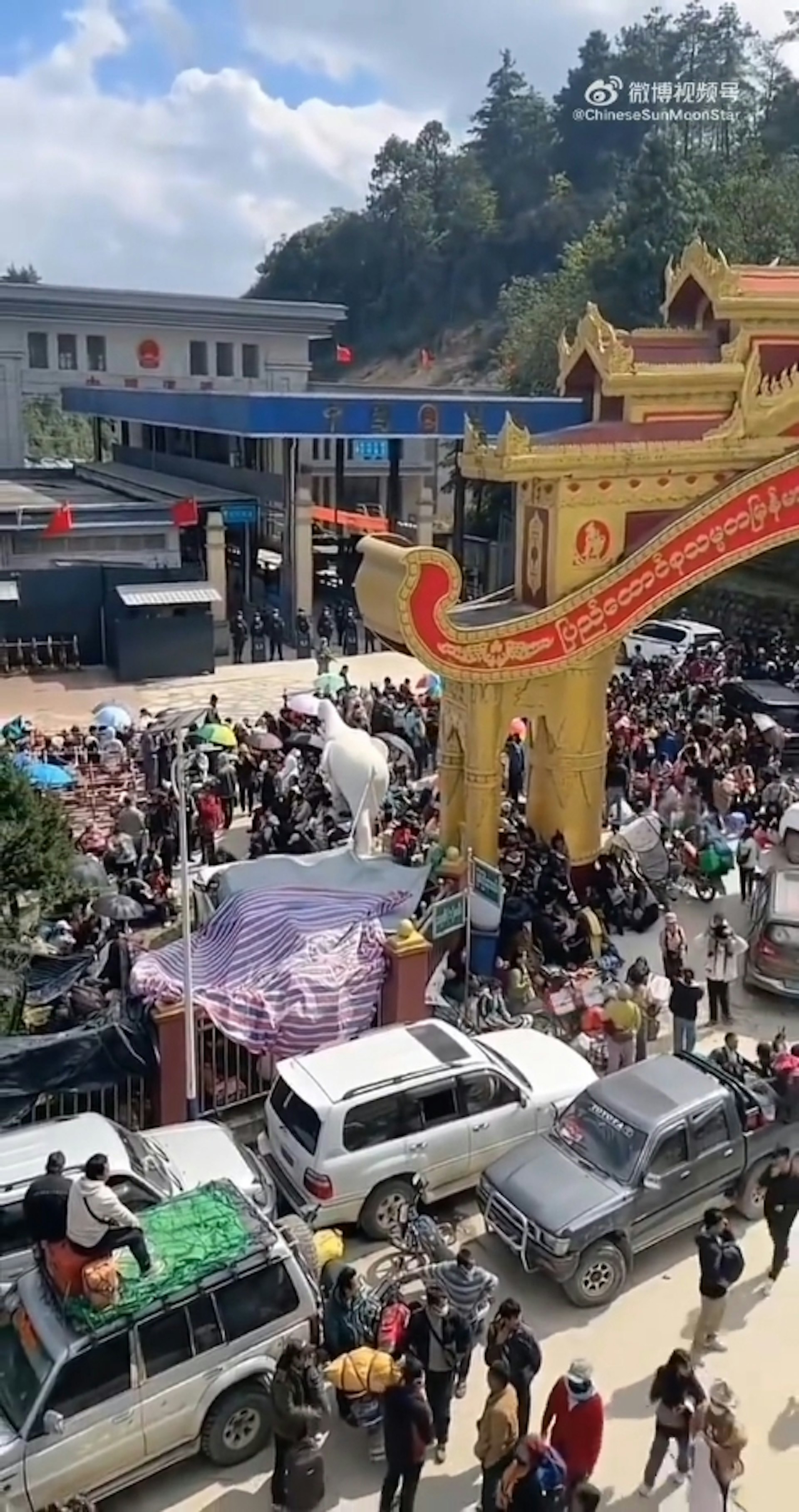 大批緬甸民眾在中緬邊境口岸聚集。(影片截圖)tvb now,tvbnow,bttvb) R q5 n% _1 E+ G7 p6 ~8 M